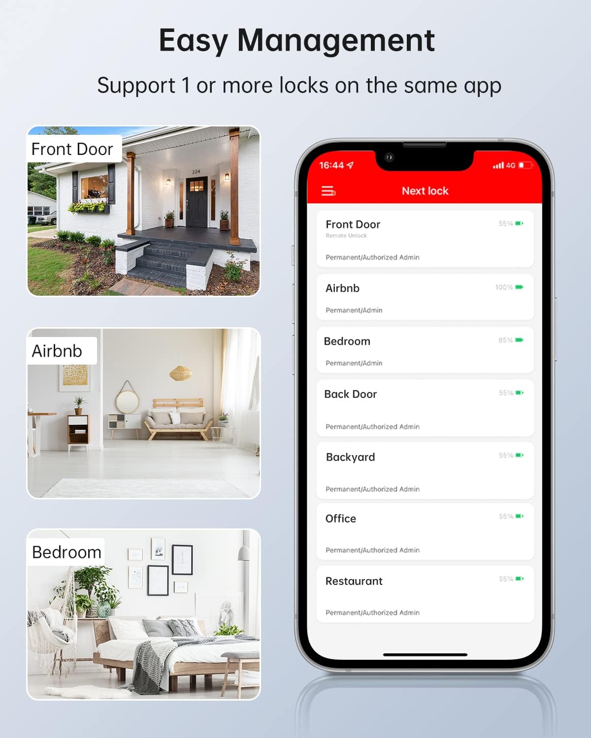 • Remotely Unlock:The G2 gateway connects to the TT Lock App to achieve remotely unlock, which is no longer to be limited by the Bluetooth unlocking distance. Meanwhile, it supports to share, modify, and delete E-key anytime, anywhere. Real-time monitoring of door status, battery life and unlock activity logs.