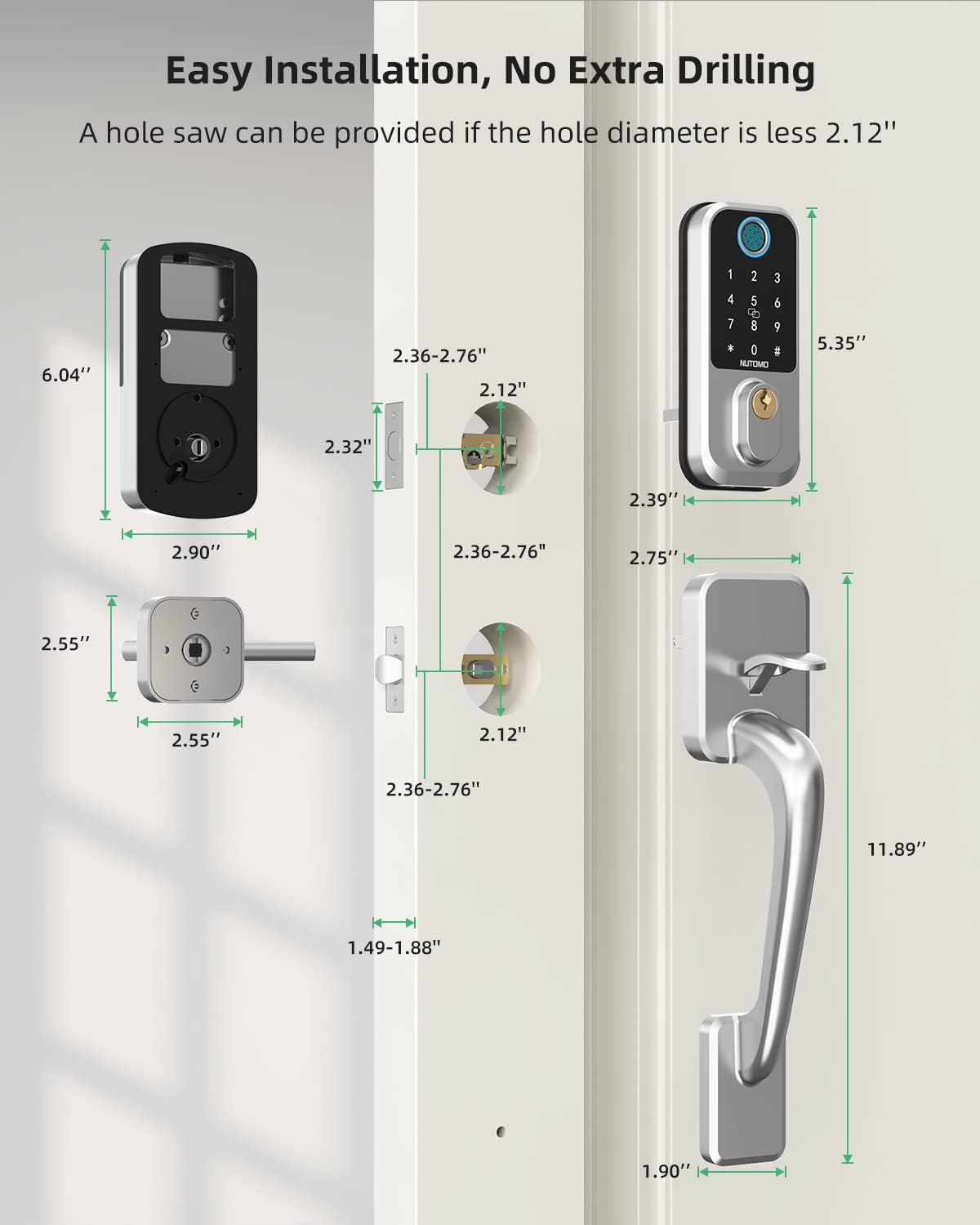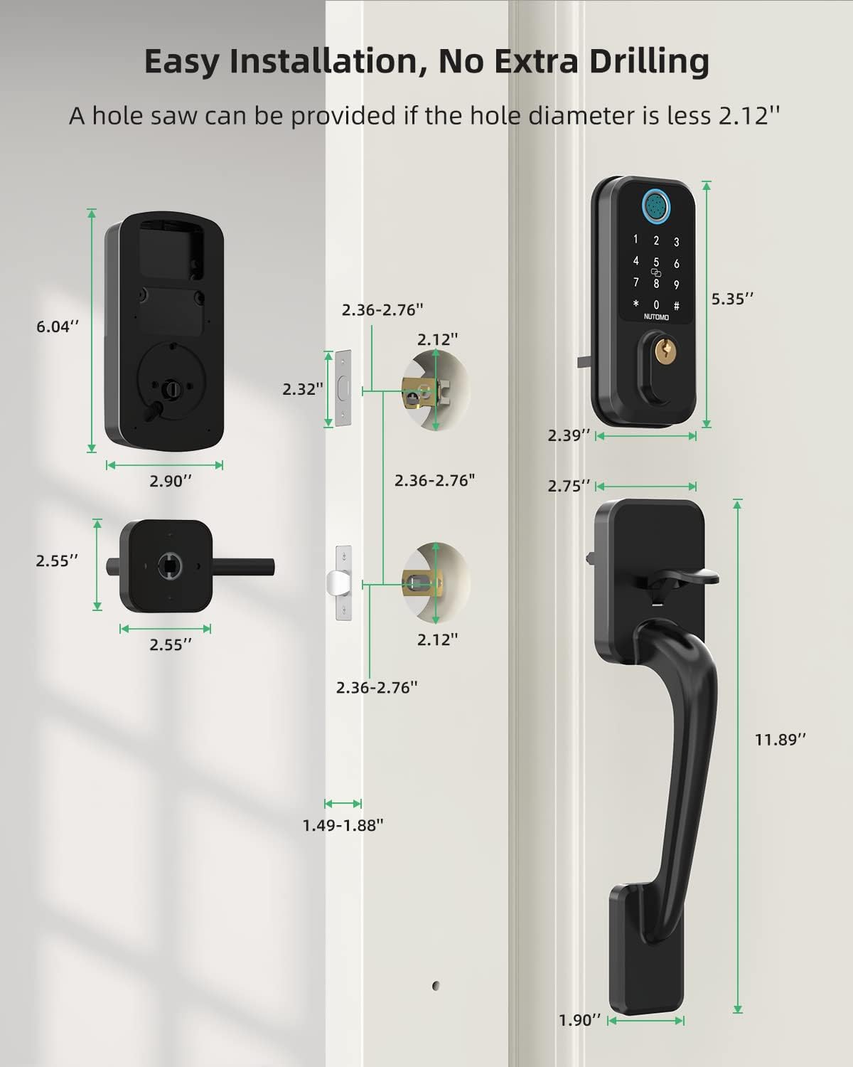 • 🔒【Easy to Use & Higher Security】This door lock with keypad is super easy to install in minutes, no need a locksmith. Different from other locks, Nutomo front door lock set is made of Heavy duty Alloy material for both interior/exterior lock. (Most of seller sell plastic interior lock), provide higher steady and security. Fits wooden doors, door thickness 1.49-1.88 inch, hole diameter 2.12 inch. (🔒 If your existing hole is less than 2.12 inch, we can provide a hole saw, please contact us).