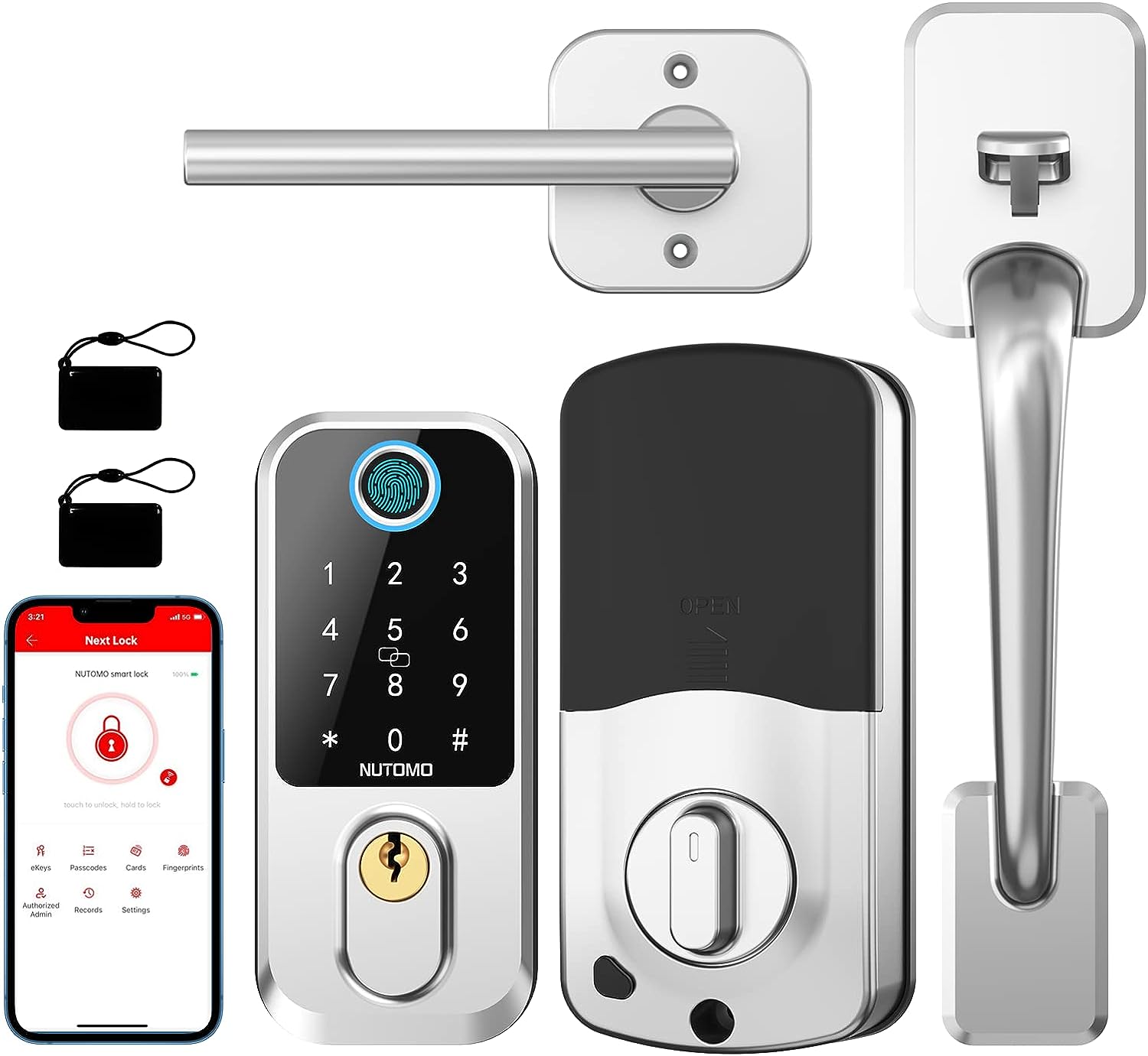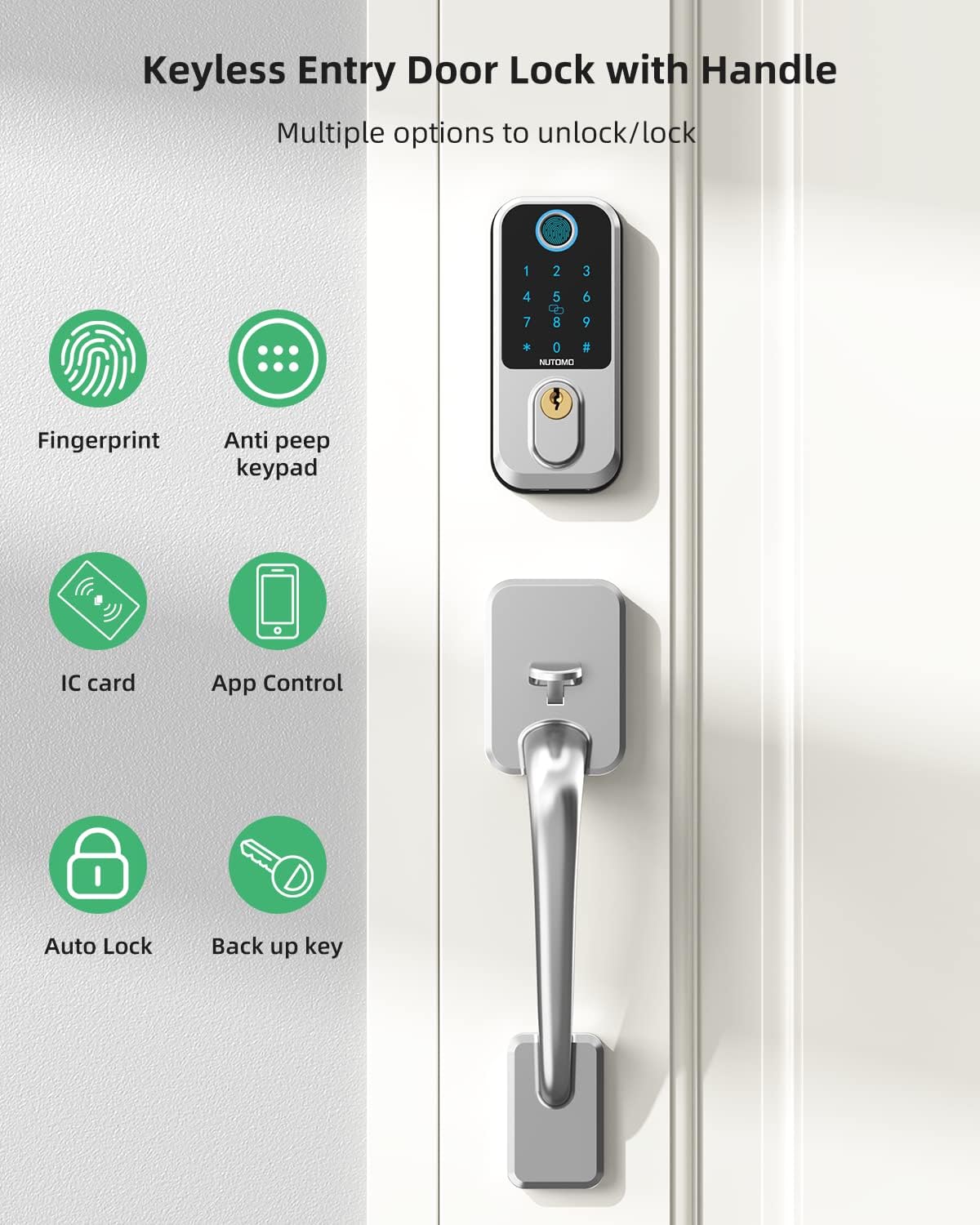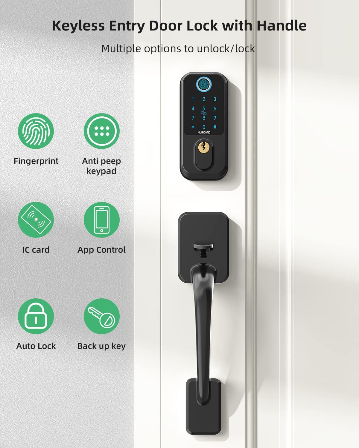 • 🔒【App Control Sharing】No extra fee on the App. Generate Permanent/custom codes for visitors even you're away. Nutomo keyless entry door lock deadbolt with handle set provide 250+ Guest Passcodes, and 1000+authorized admins. 1 or more locks can be used on the same app. Easy to manage your houses and vistors,check records who comes and goes.