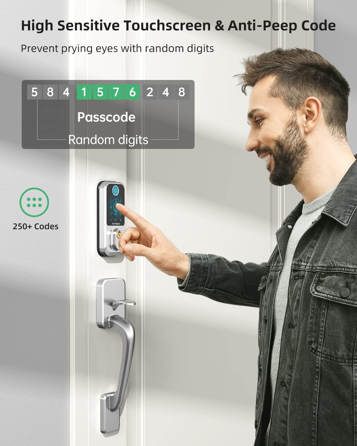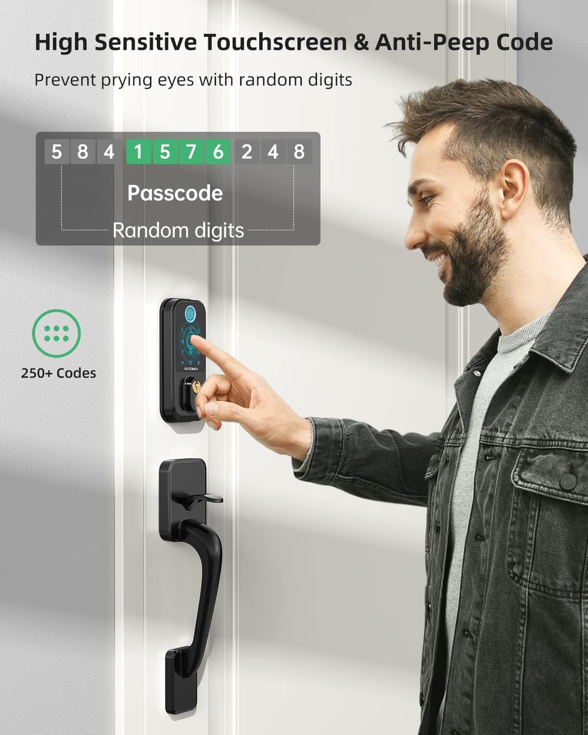 • 🔒【High Accuracy Fingerprint & Anti-Peep Touch Screen】Our entry door lock set has higher accuracy finerprint technology, easily access to the door within 0.1 seconds.Carries OLED Anti-Peep Keypad, bring you a better sense of touch and protect your privacy. Designed for US families, equipped with waterproof IP63 rating, Ensure your keypad door lock with handle operates normally in harsh environments. (-20℉~158℉).