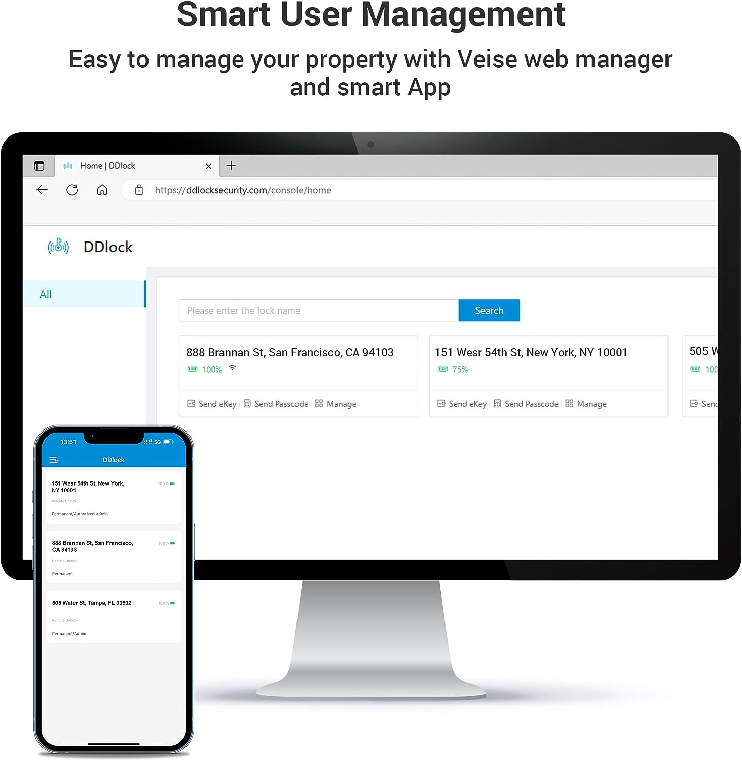 • App & Web Portal Control: You can control the smart lock via smartphone, remotely generate eKey and grant access, manage users, and view records in the app and website management system. The App & Web is free and can be used forever.