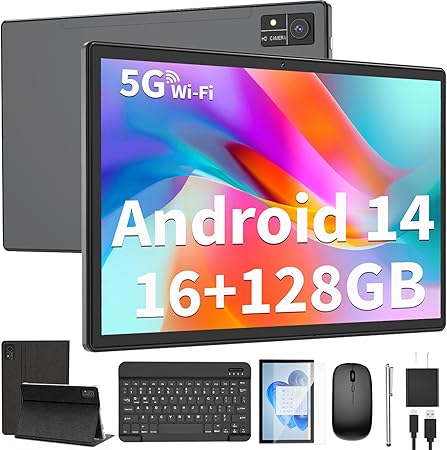 Android Tablet with Keyboard, 10 inch Android 14 Tablet, 16GB RAM 128GB ROM, 1TB Expand, 5G WiFi, Bluetooth, 8000mAh Battery, GMS Certified, 2 in 1 Tablet with Keyboard, Mouse, Case, Stylus(Black)