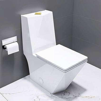 WinZo Modern Square Toilet One Piece With Golden Push Button Dual Flush Elongated Rectangle Comfortable ADA Height, White with golden Parts