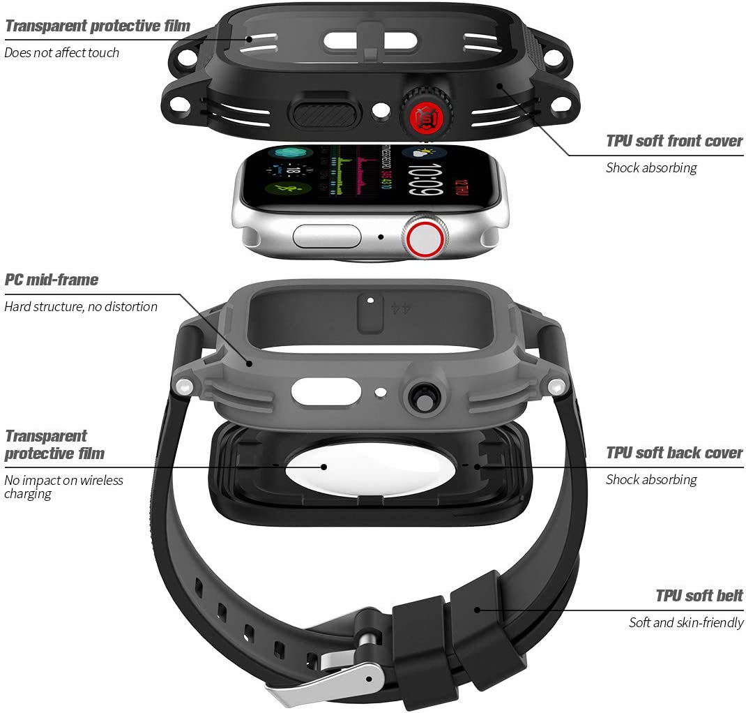 • 【COMPATIBLE MODEL】: Specifically designed waterproof case with band compatible for Apple Watch Series 6/5/4/SE 40mm, Not compatible with other models.PC bumper combined with TPU material,soft silicone strap band make it comfortable to wear.