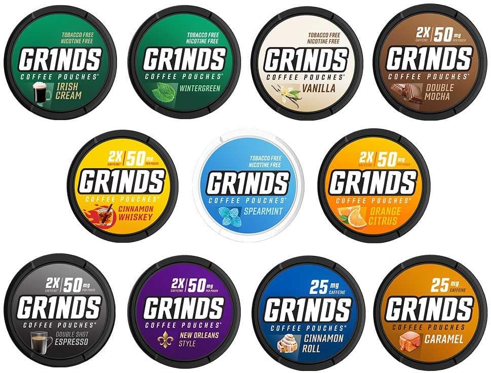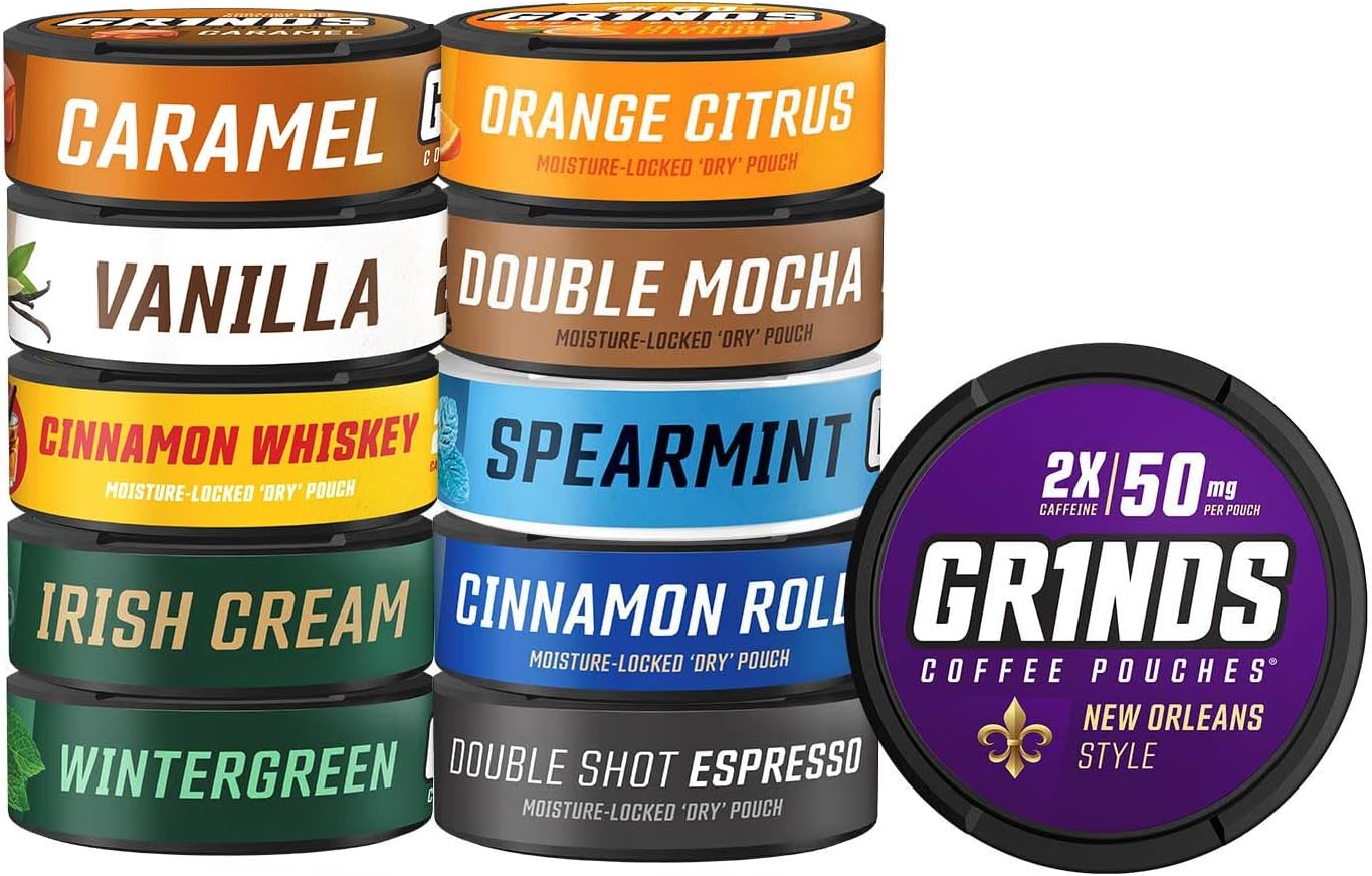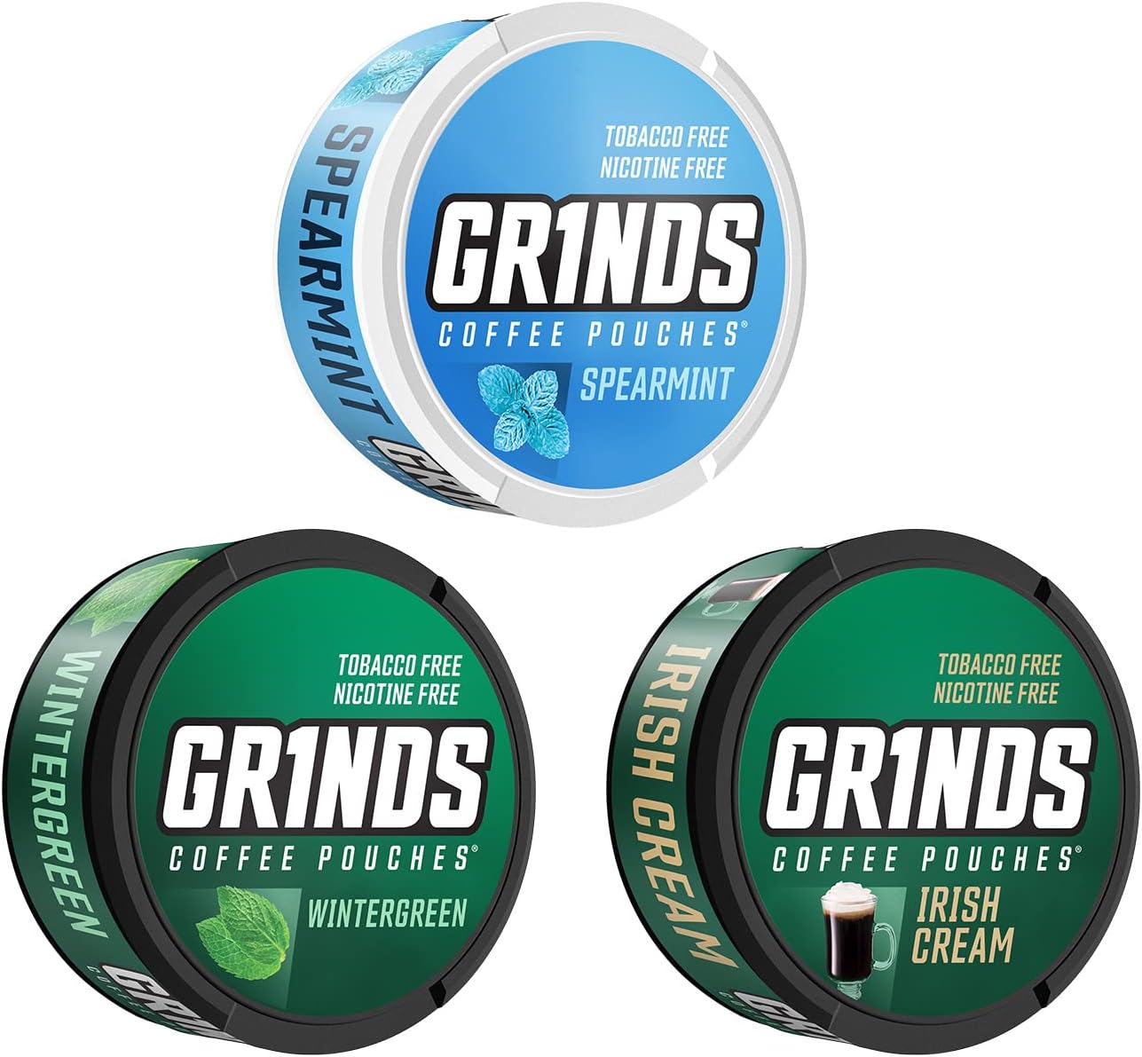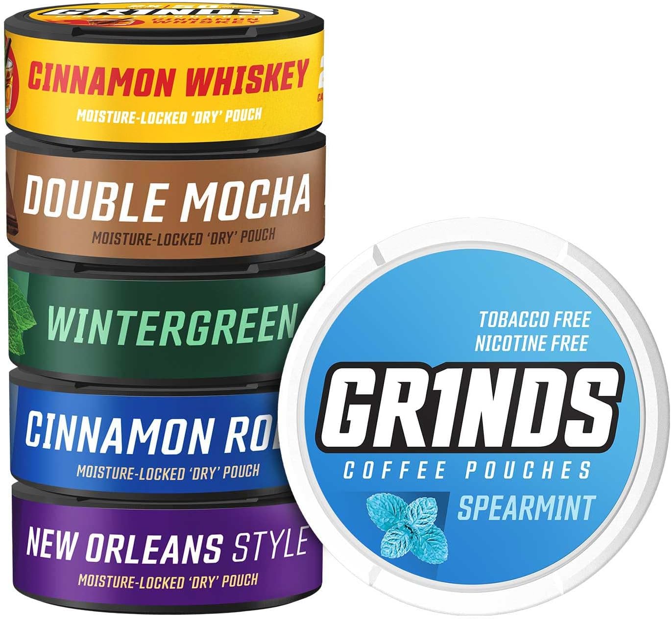 Grinds Coffee Pouches | 6 Can Sampler | Caramel, Espresso, Cinnamon Roll, Vanilla, Wintergreen, Spearmint | Tobacco Free, Nicotine Free Healthy Alternative | 1 Pouch eq. 1/4 Cup of Coffee