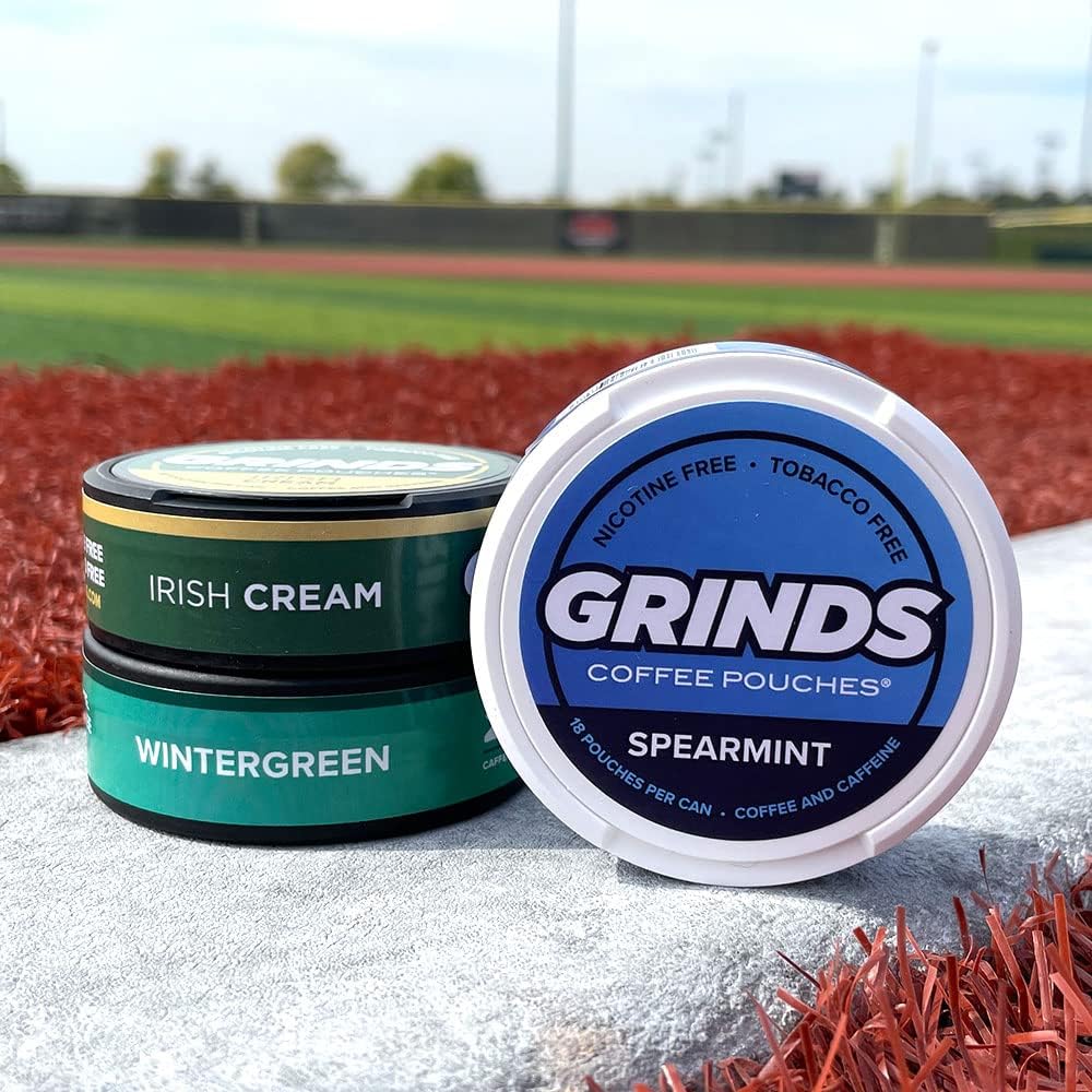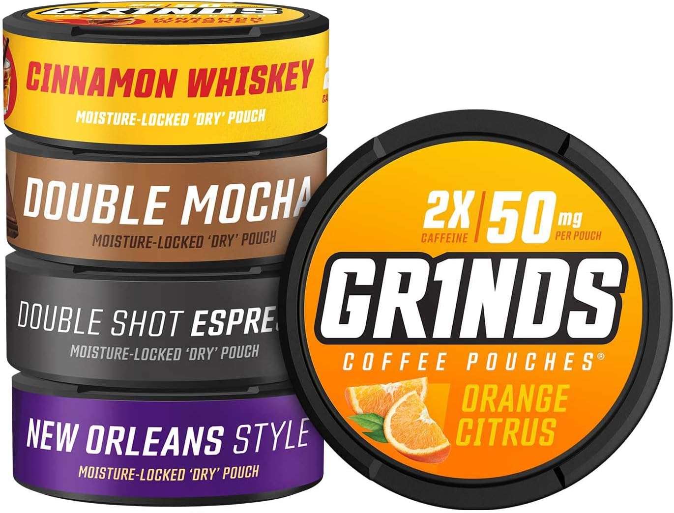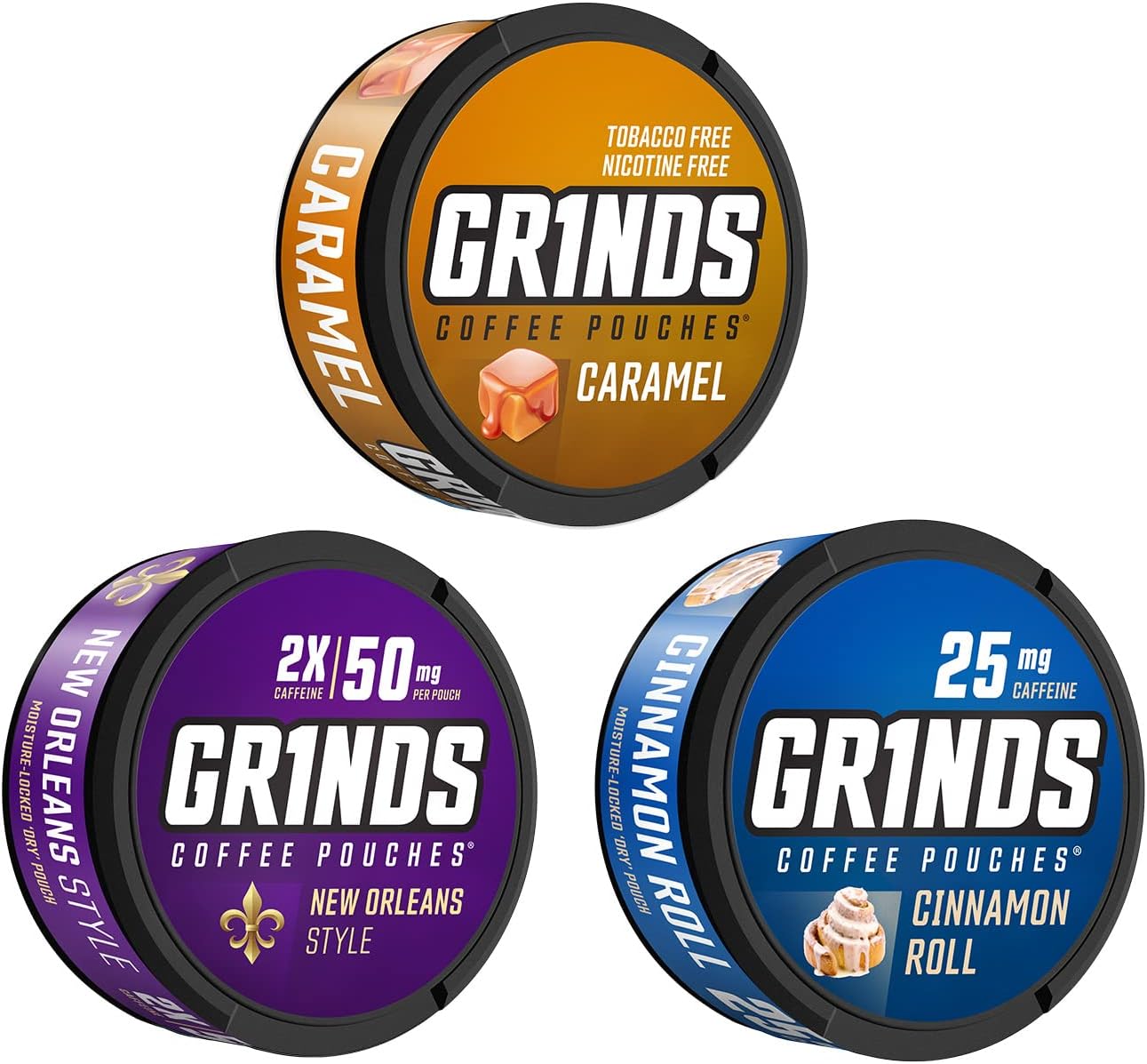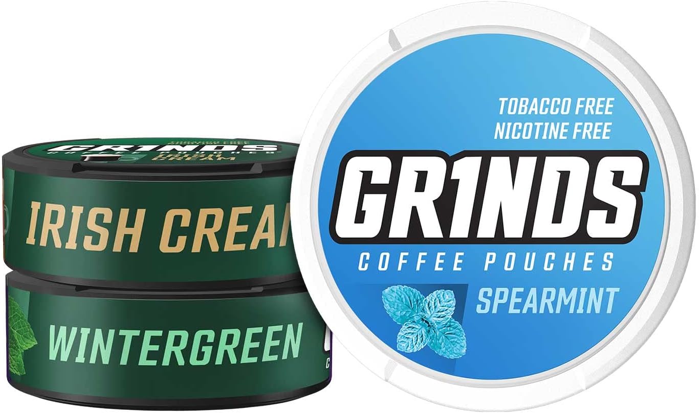 Grinds Coffee Pouches | 6 Can Sampler | Caramel, Espresso, Cinnamon Roll, Vanilla, Wintergreen, Spearmint | Tobacco Free, Nicotine Free Healthy Alternative | 1 Pouch eq. 1/4 Cup of Coffee