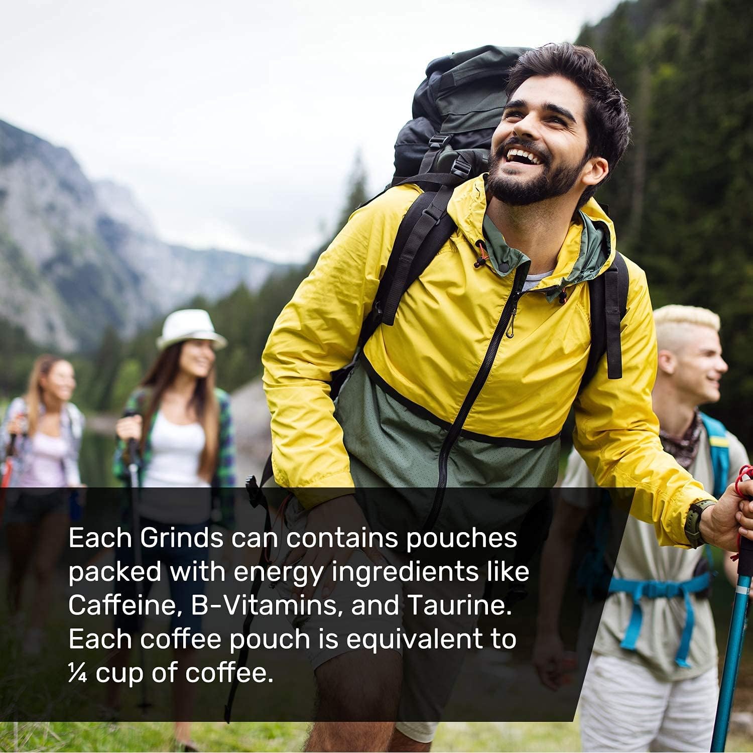 • ENERGY BOOST: With 18 pouches per can, each coffee dip pouch equals about 1/4 of a cup of coffee, or approximately 20–25 mg of caffeine, which makes each entire can of Grinds Coffee Pouches add up to the caffeine equivalent of 4–5 cups of coffee.
