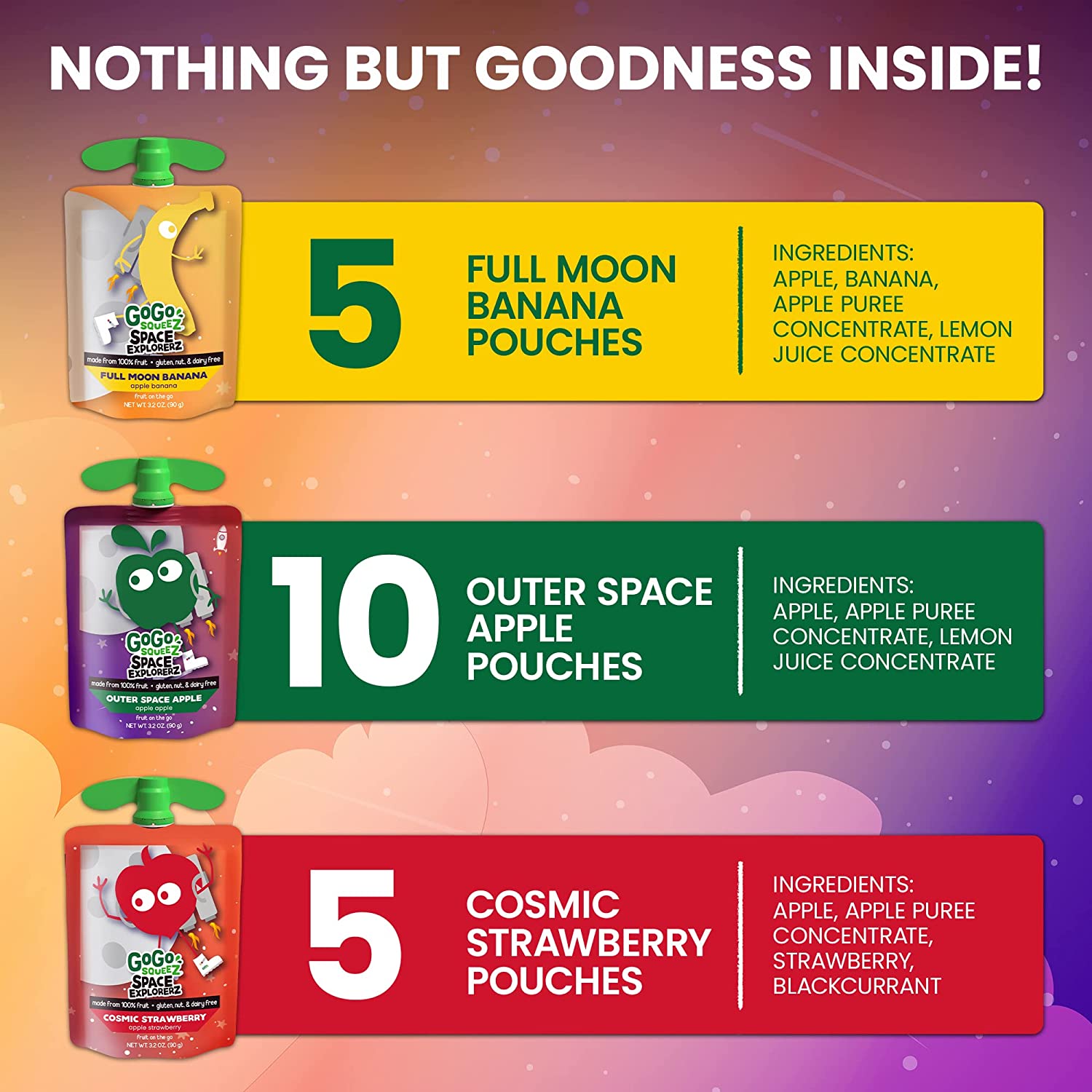 • Stock your pantry or fridge with this pack of 20, 3.2 ounce kid-approved snack pouches (3 flavors to choose from); GoGo squeeZ Fruit on the Go squeeze pouches are kitchen pantry safe (no refrigeration required)