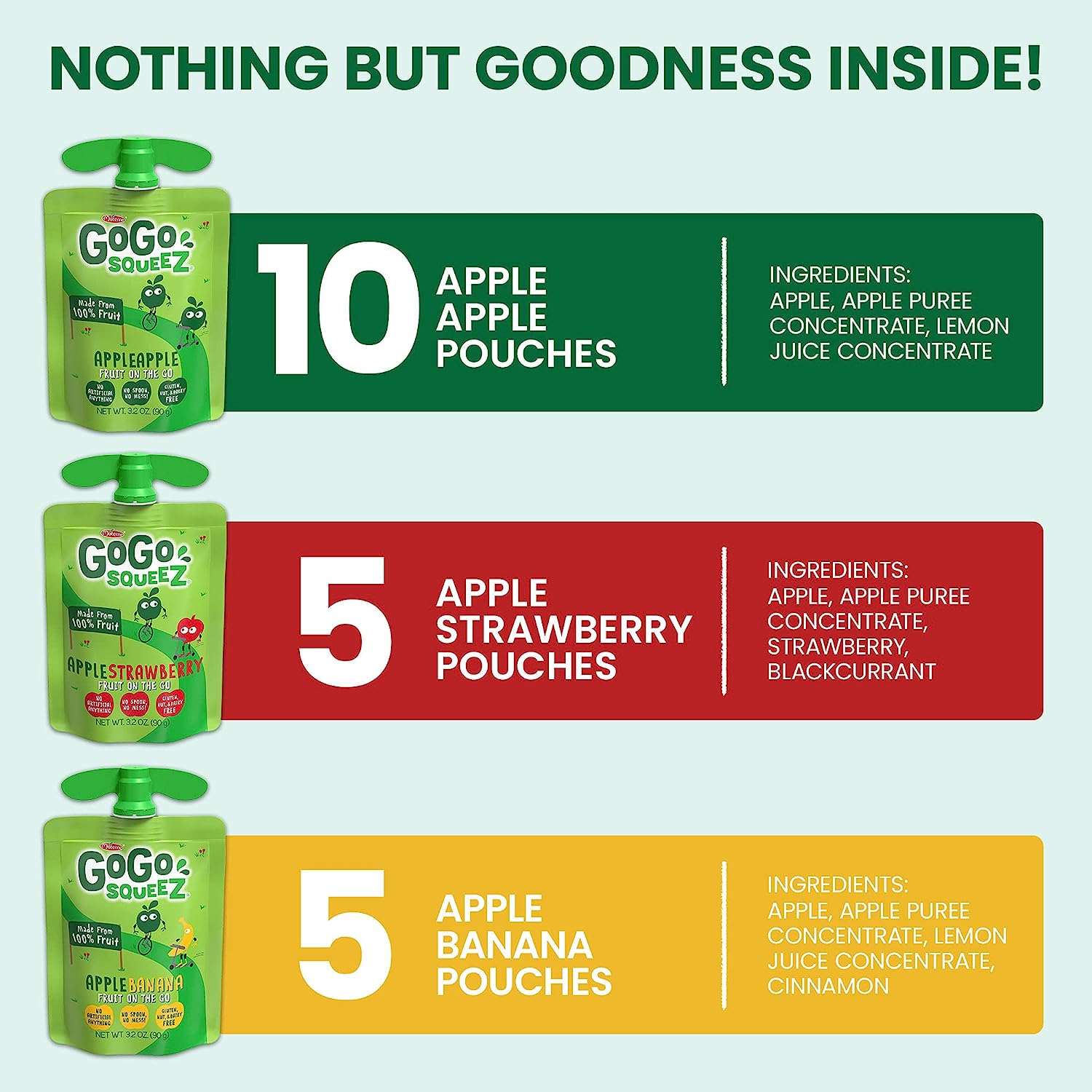 GoGo squeeZ Fruit on the Go Variety Pack, Apple, Banana & Strawberry, 3.2 oz (Pack of 20), Unsweetened Fruit Snacks for Kids, Gluten Free, Nut Free and Dairy Free, Recloseable Cap, BPA Free Pouches