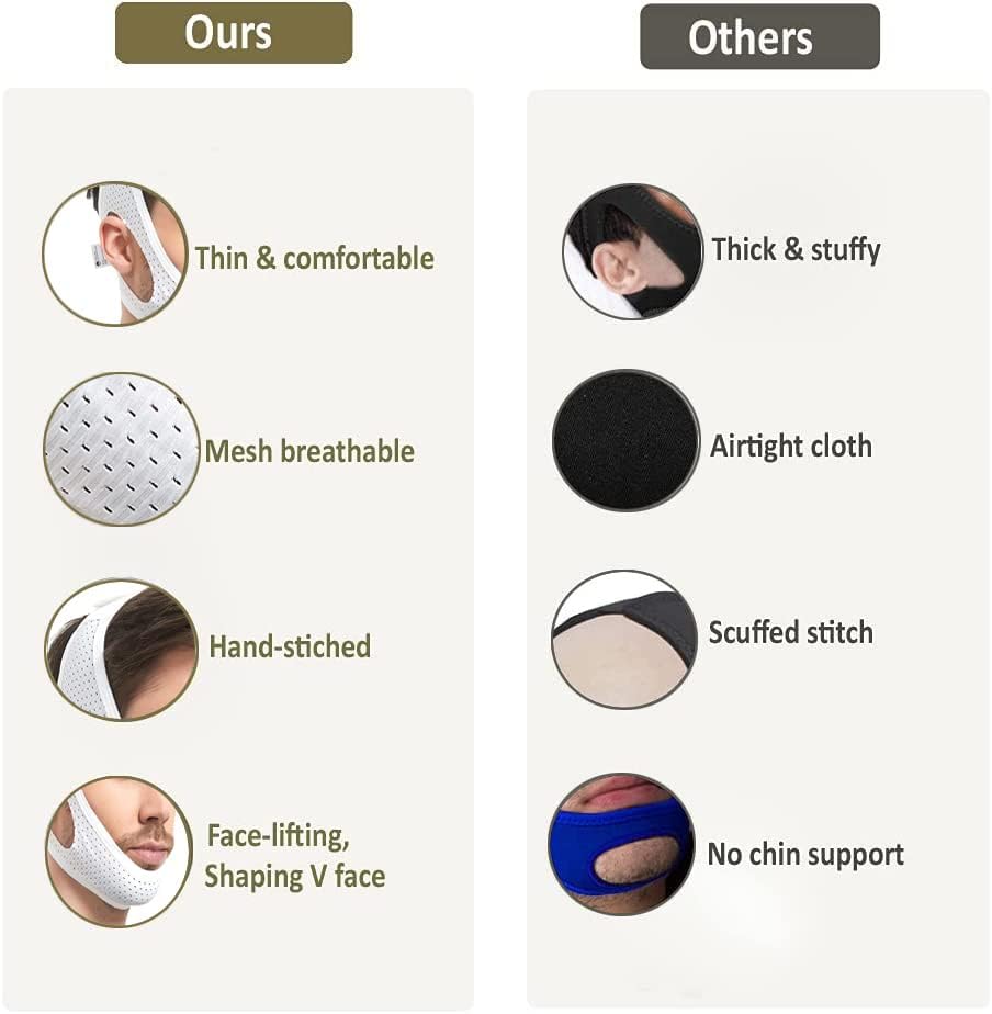• ★√【Specailly Designed & Ease of Use】One-piece cutting new design without hemming fits your face more comfortably. Easy to use, just tighten the long upper strap on the top of your head, then adjust the short side behind the ear to the back of your head.This snore stopper chin strap sleep is best snoring solutions for men women that saves you time and effort.