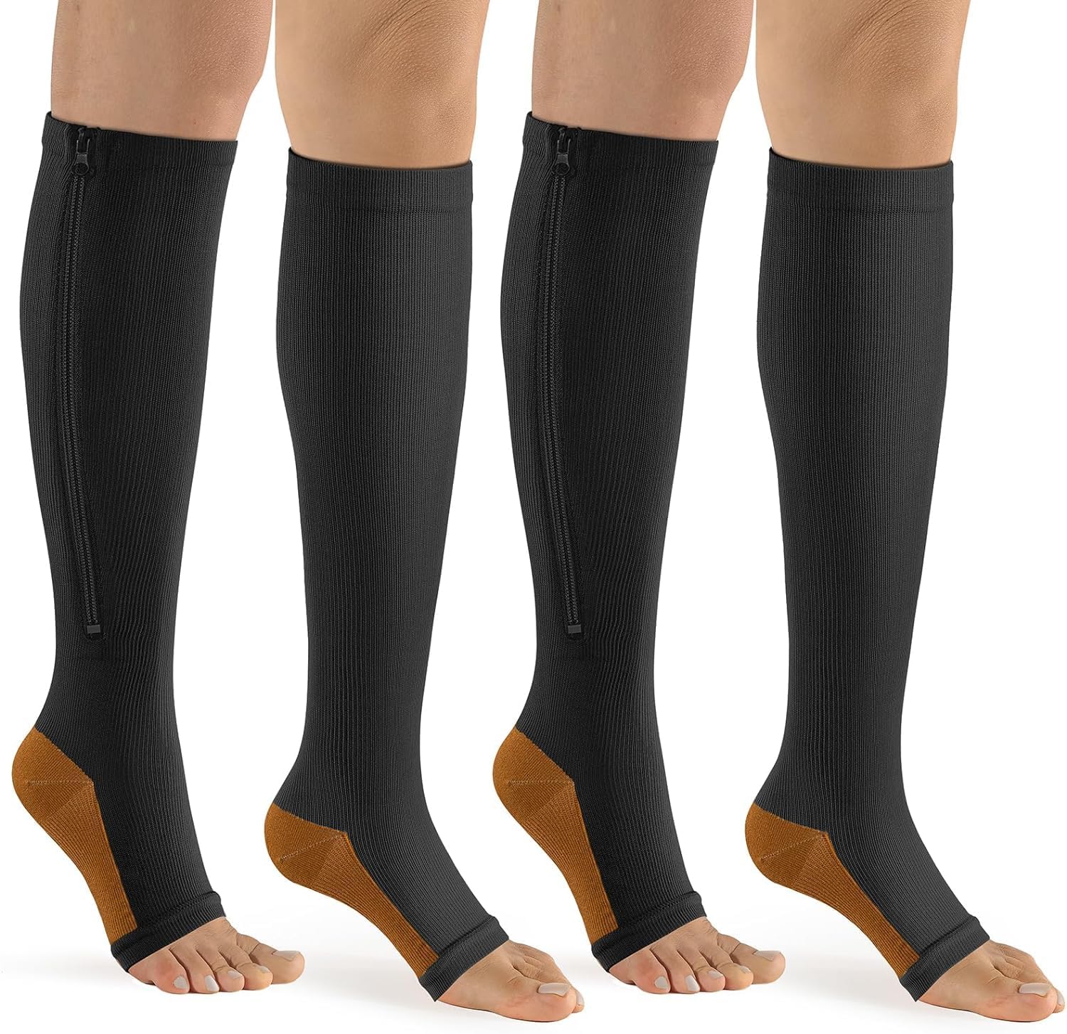Bropite Zipper Compression Socks Women & Men - 2Pairs Calf Knee High 15-20mmHg Open Toe Compression Stocking suit for Walking