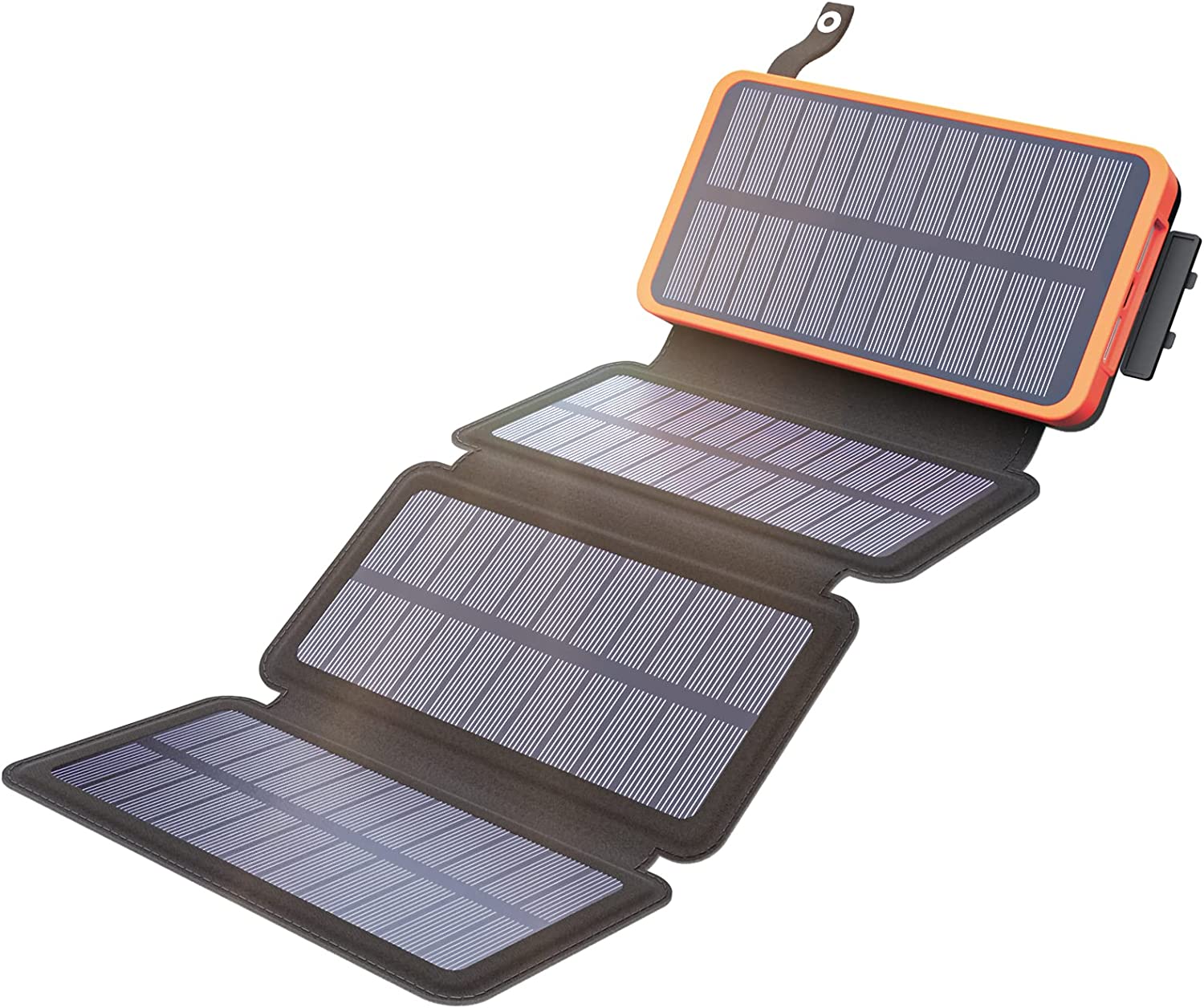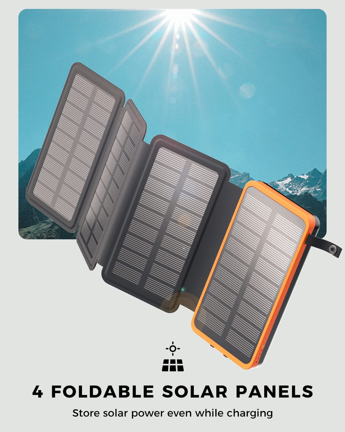 • 6W Solar Panel Charger: Its solar charging rate can reach 6W due to 4 highly efficient solar panels, which is equivalent to the speed of a 1A charger. And its foldable design makes this solar battery charger easy to hang on a backpack when hiking or camping.