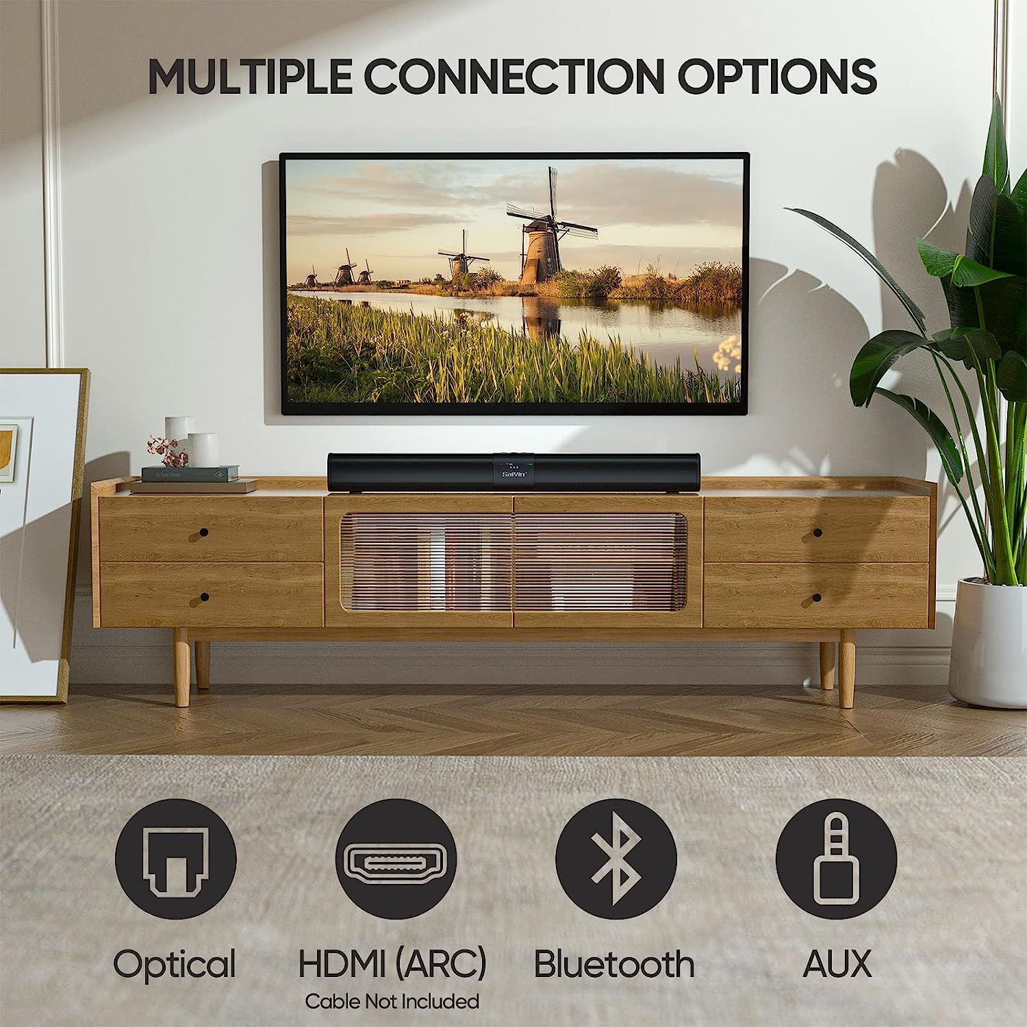 • 𝐖𝐡𝐚𝐭 𝐘𝐨𝐮 𝐆𝐞𝐭: A detachable sound bar, User Manual, Power adapter, Remote, Optical cable, AUX cable and our lifetime technical support and free accessories(HDMI cable not included).