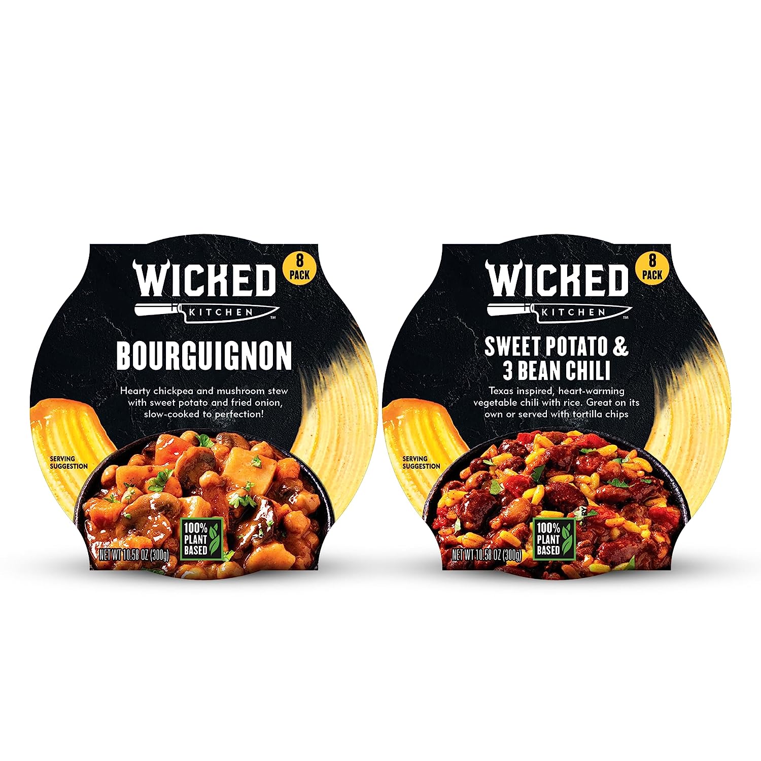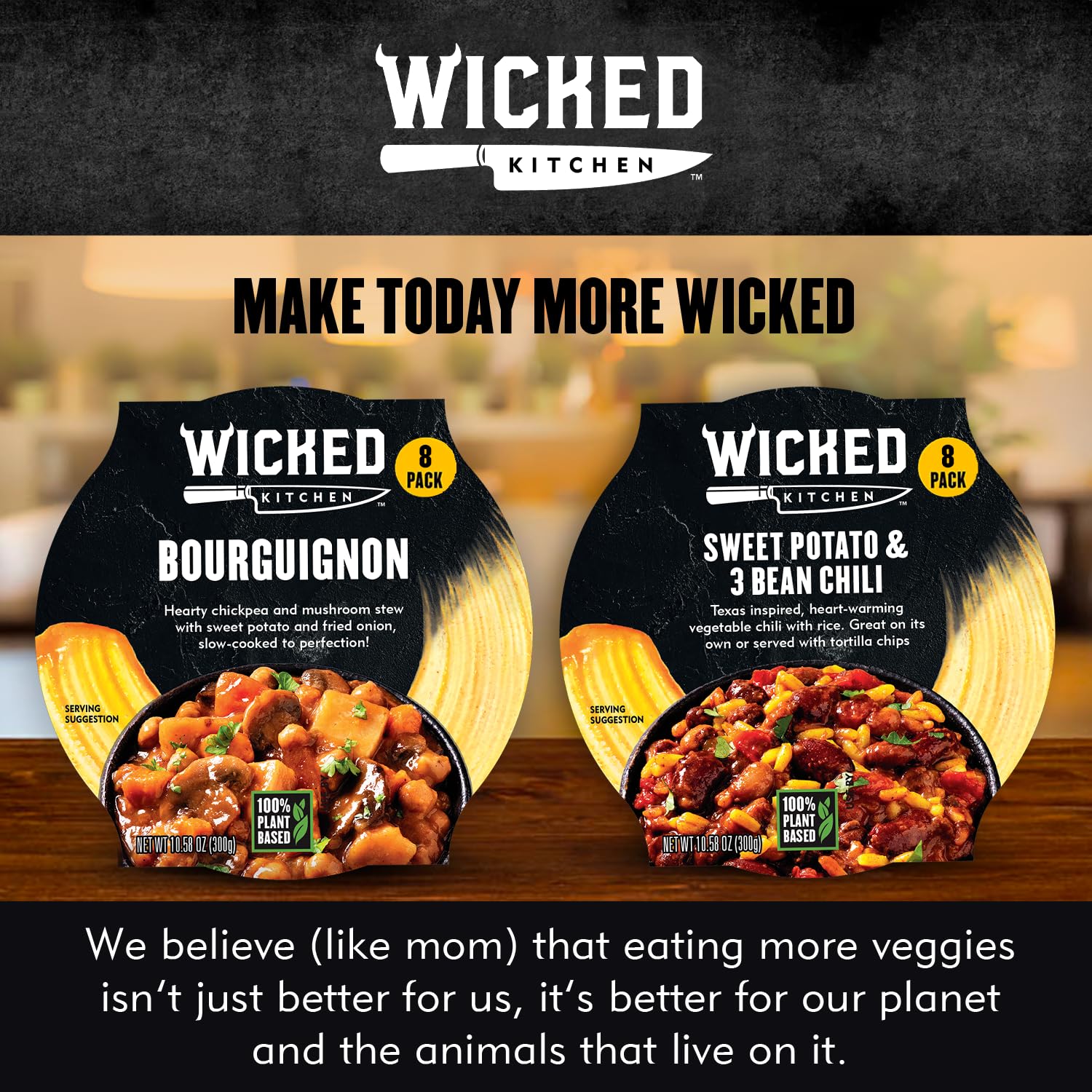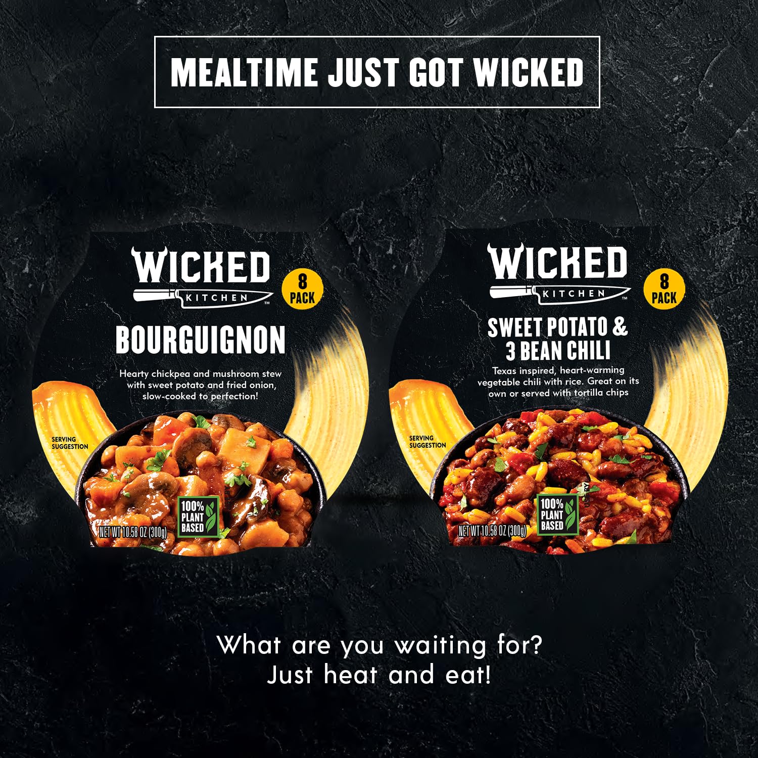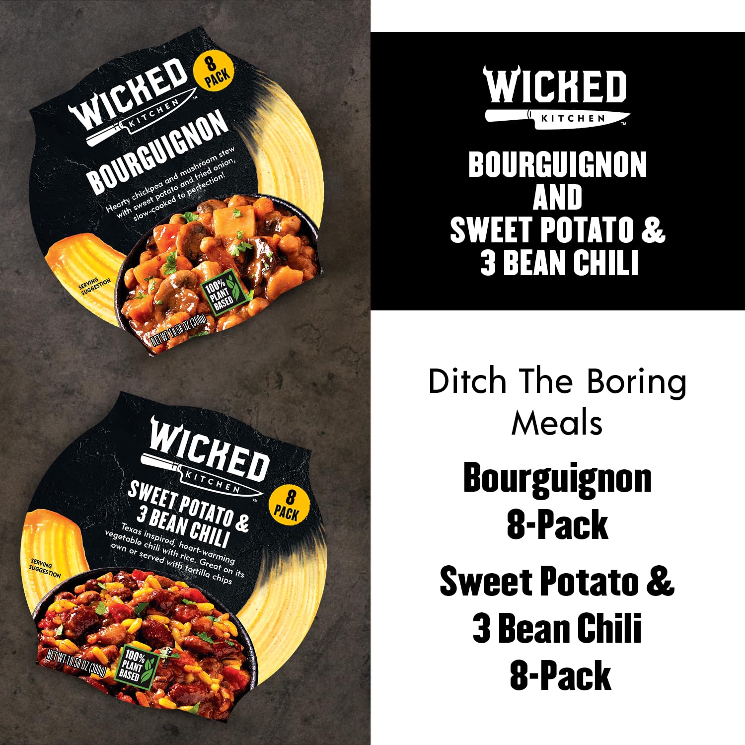 Flavor Unleashed: Wicked Kitchen Meals are chef-crafted, convenient, plant-based comfort food with seriously bold flavors. Our Bourguignon and Sweet Potato & Three Bean Chili are sure to satisfy. 8-Pack of Bourguignon and 8-Pack Sweet Potato & Three Bean Chili.