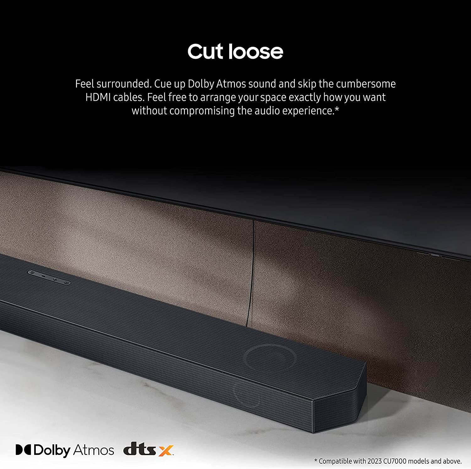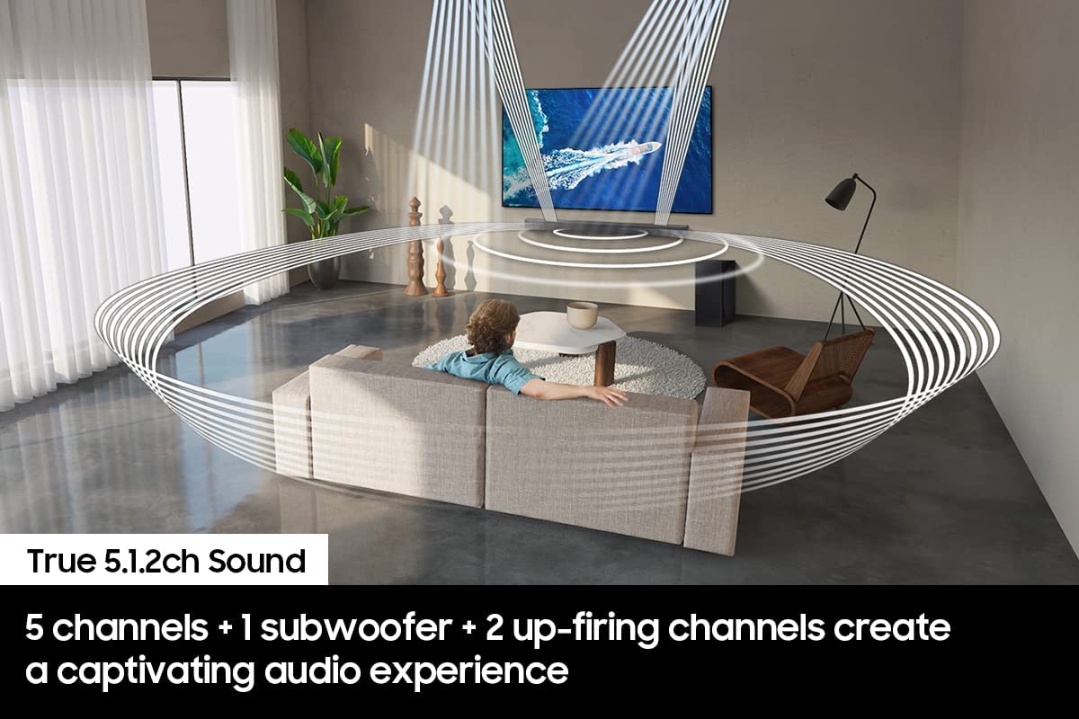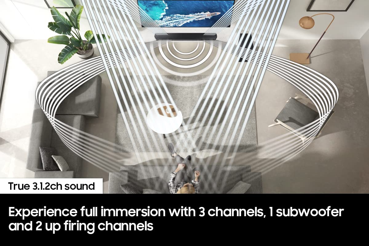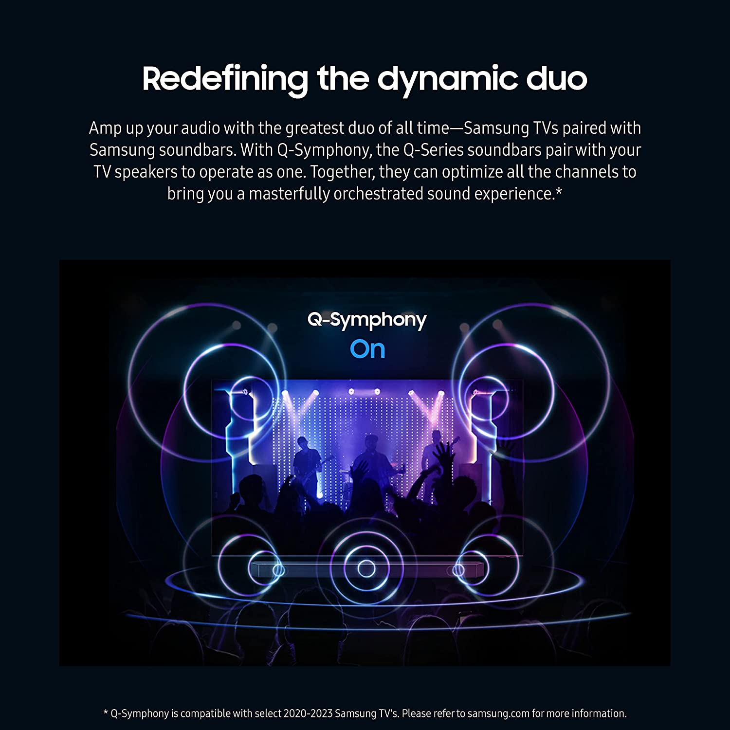 *Q-Symphony is compatible with select 2020 - 2022 Samsung TVs. Please refer to samsung.com for more information. Soundbar must be connected to TV via HDMI to enable Q-Symphony function. **SpaceFit Sound is compatible with 2021 Samsung QLED TV's (Q70↑ and above). Please refer to samsung.com for more information. ***An Amazon Echo Device is required to use this feature. This service is provided by Amazon and can be terminated at any time. Amazon, Alexa, and all related logos are trademarks of Amazon.com, Inc. or its affiliates. Some features and functions provided by connected devices may be limited or not be supported to use. Content Services may vary by region & are subject to change without notification. ****This Samsung soundbar supports AirPlay2 and requires iOS 11.4 or later. Apple, and AirPlay are trademarks of Apple Inc., registered in the U.S. and other countries. *****Compatible with select TVs and select gaming consoles (e.g. Xbox X, PS5). Game console sold separately.