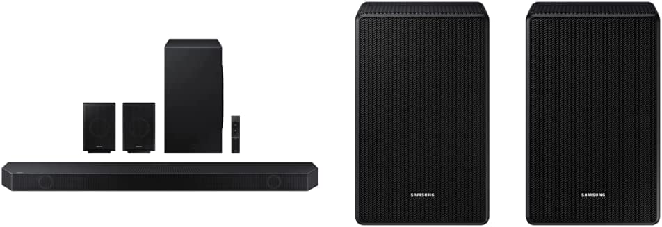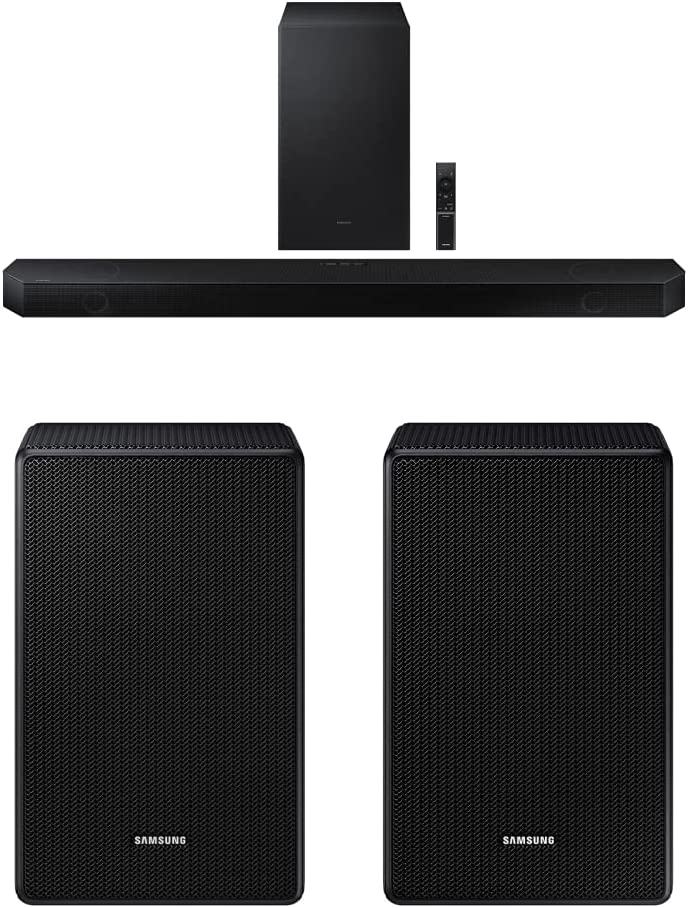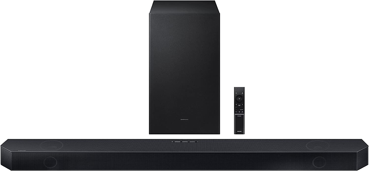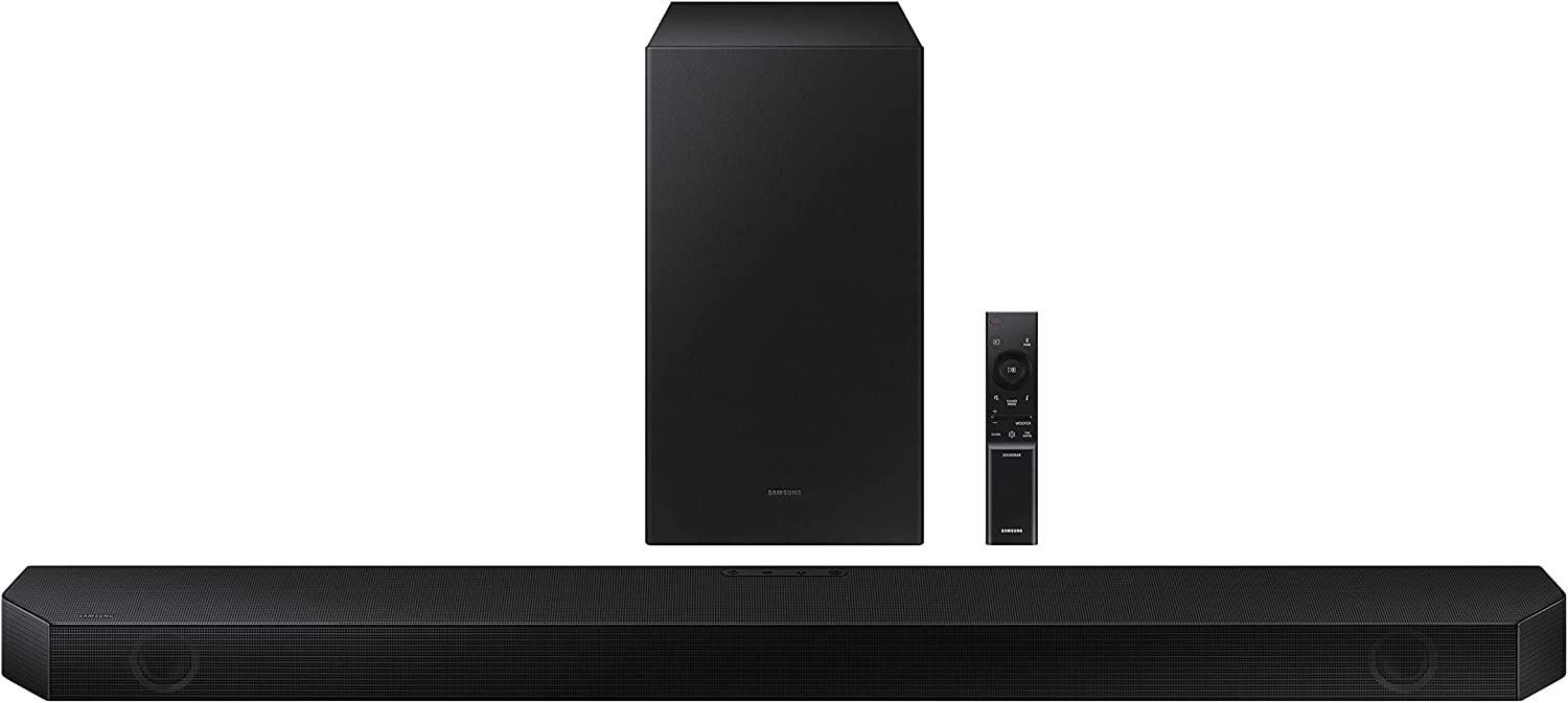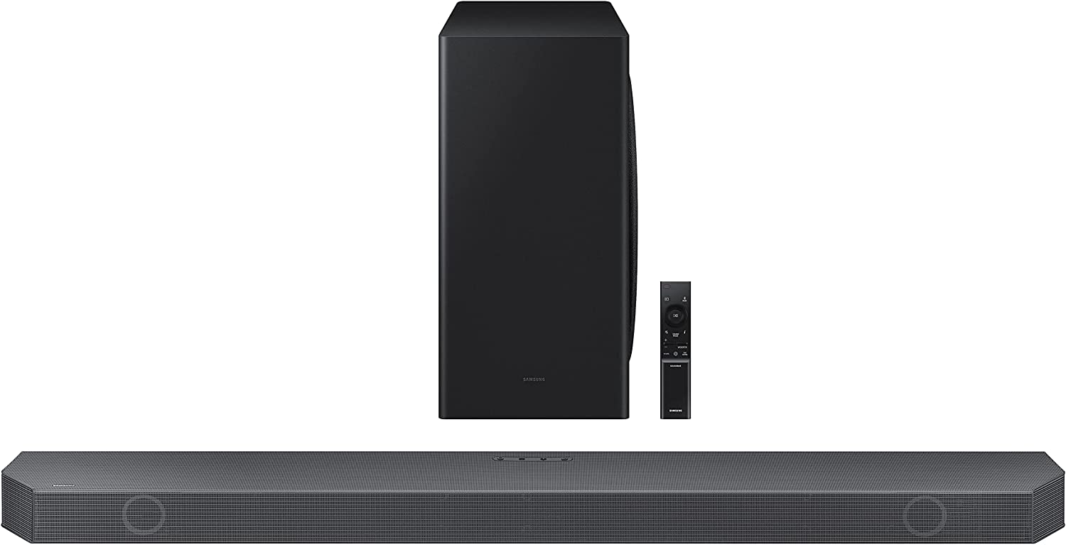 *Q-Symphony is compatible with select 2020 - 2022 Samsung TVs. Please refer to samsung.com for more information. Soundbar must be connected to TV via HDMI to enable Q-Symphony function. **SpaceFit Sound is compatible with 2021 Samsung QLED TV's (Q70↑ and above). Please refer to samsung.com for more information. ***An Amazon Echo Device is required to use this feature. This service is provided by Amazon and can be terminated at any time. Amazon, Alexa, and all related logos are trademarks of Amazon.com, Inc. or its affiliates. Some features and functions provided by connected devices may be limited or not be supported to use. Content Services may vary by region & are subject to change without notification. ****This Samsung soundbar supports AirPlay2 and requires iOS 11.4 or later. Apple, and AirPlay are trademarks of Apple Inc., registered in the U.S. and other countries. *****Compatible with select TVs and select gaming consoles (e.g. Xbox X, PS5). Game console sold separately.