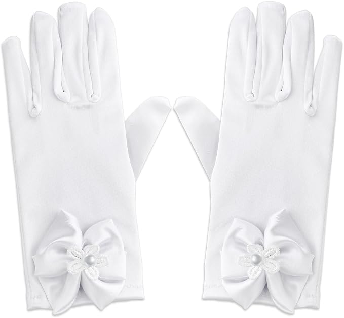 KALIONE White Gloves for Girls First Communion Gloves White Dress Gloves, Girls Fancy Satin Gloves with Bow, 3-12 Years Girl Princess Gloves for Wedding Gorgeous Special Occasion, Formal Pageant