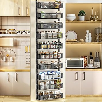 10-tier Over The Door Pantry Organizer with Mesh Baskets, Adjustable & Stable Hanging Spice Rack for Kitchen, Bathroom, Bedroom, and Baby Essentials Storage (16" W 10-Tiers, Black)