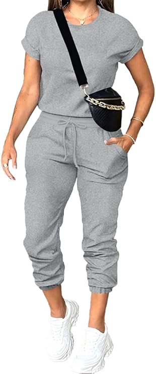 PINSV Women's 2 Piece Outfits Tracksuit Sets Short Sleeve Tops Jogger Pants with Pockets