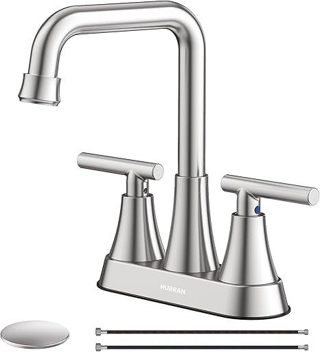 Bathroom Sink Faucet, Hurran 4 inch Brushed Nickel Bathroom Faucets for Sink 3 Hole with Pop-up Drain and Supply Lines, Stainless Steel 2-Handle Centerset Faucet for Bathroom Sink Vanity RV Restroom