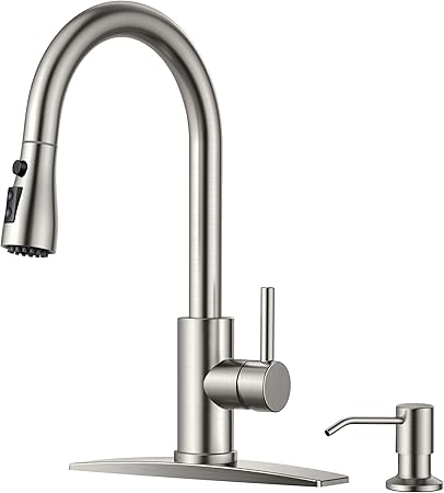 FORIOUS Kitchen Faucets with Soap Dispenser and Pull Down Sprayer, Brushed Nickel, High Arc Single Handle Classic 3 Modes Stainless Steel Faucet for Kitchen Sink Farmhouse RV Bar Laundry Camper