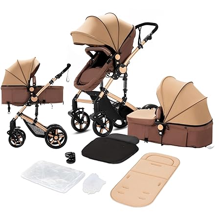 2 in 1 Baby Stroller with Bassinet, Reversible Newborn Foldable Pram, Infant High Landscape Pushchair, Portable Standard Stroller, Reclining Buggy, Baby Carriage (2US588-Khaki)
