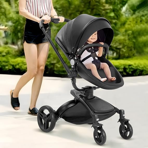 2 in 1 High Landscape Convertible Baby Stroller, PU Leather Newborn Reversible Bassinet Pram, 360¥� Rotating Foldable with Adjustable Canopy, Aluminum Structure, 5-Point Harness for Infant & Toddler