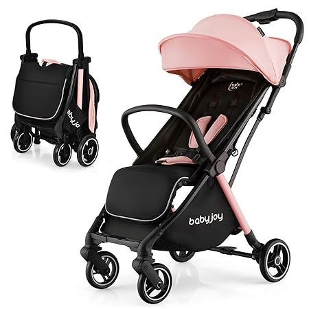 BABY JOY Lightweight Baby Stroller, Compact Travel Stroller for Airplane, Infant Toddler Stroller w/Adjustable Backrest & Canopy, Storage Basket, Self Standing Gravity Fold, Aluminium Frame (Pink)