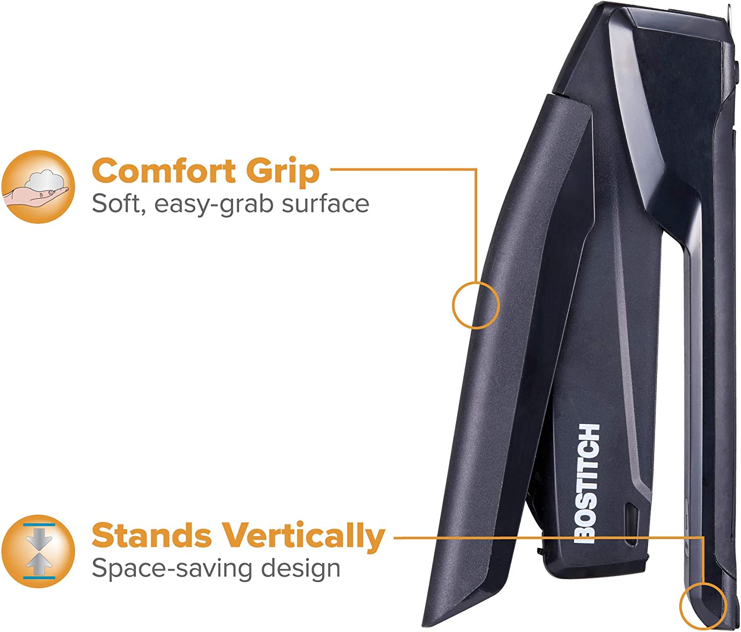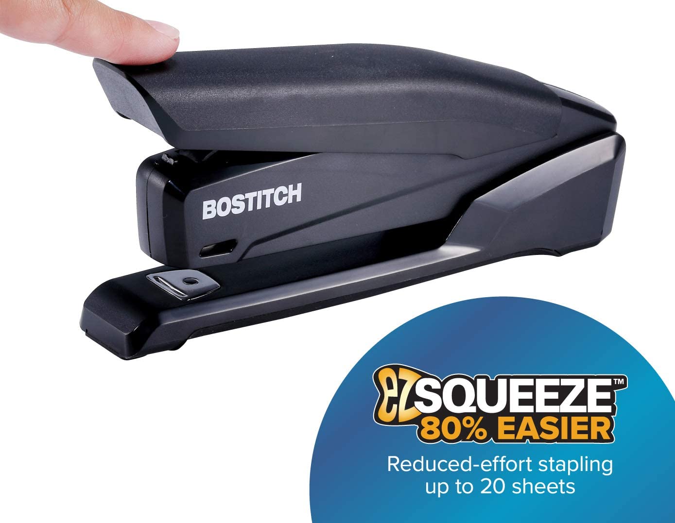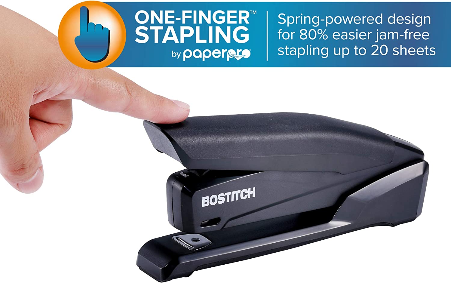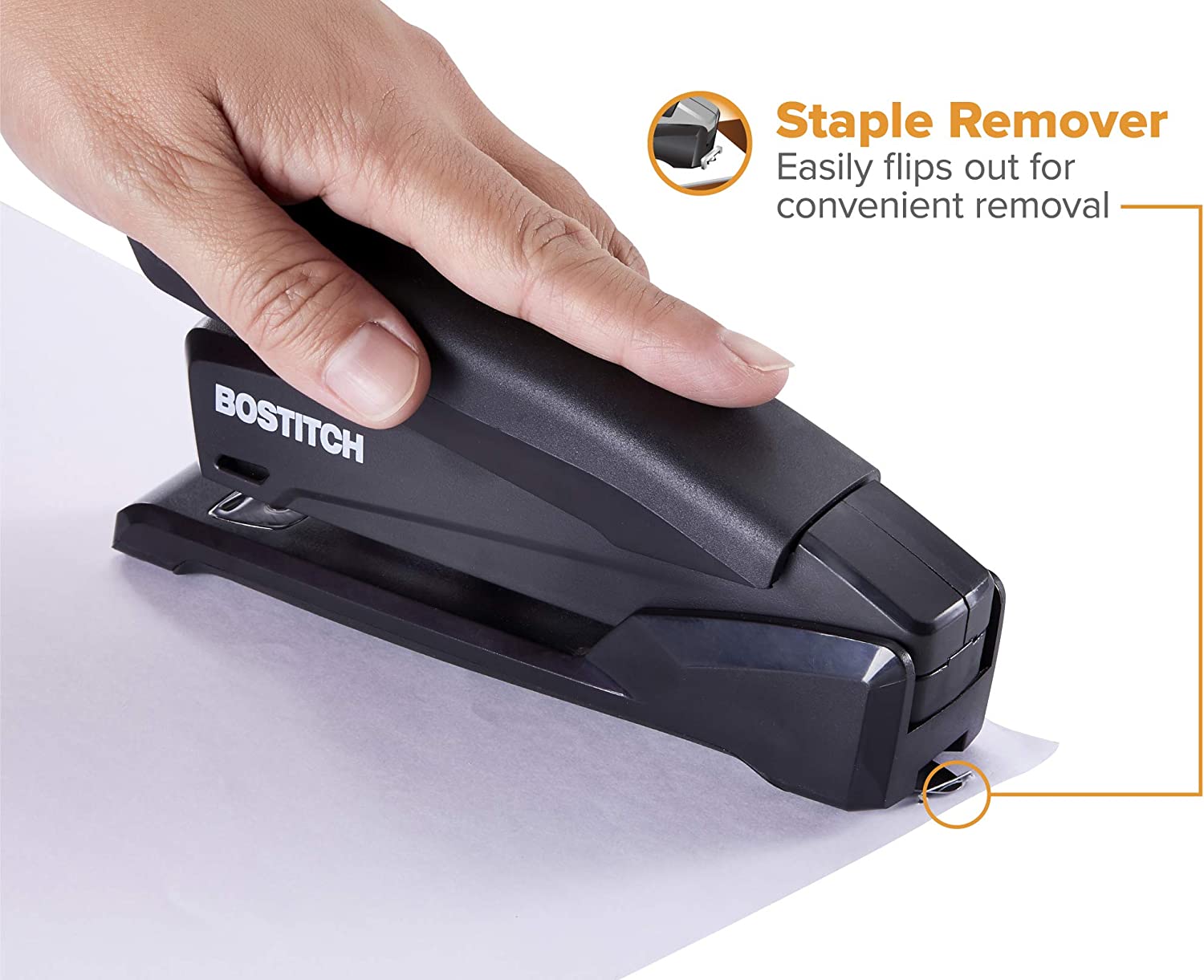 Effortless performance from a stapler that’s 80% easier to use: use just one finger to staple up to 20 Sheets of paper. Designed for convenience, it features a built-in staple remover for quick fixes and a hidden staple storage compartment to keep extra staples handy. Jam-free operation allows for smooth stapling of up to 20 Sheets. Opens for bulletin board tacking and crafting. Stands vertically or horizontally for easier access and storage. USES premium standard staples. Perfect for school, work, or the home office.
