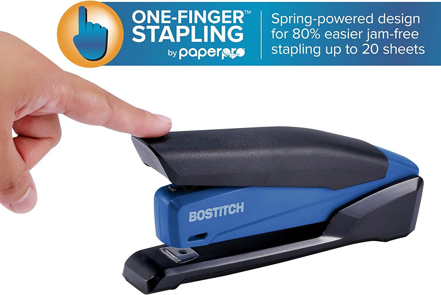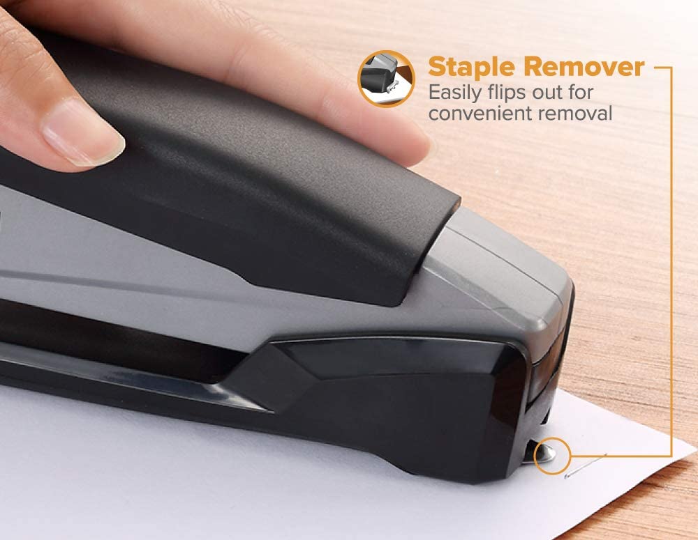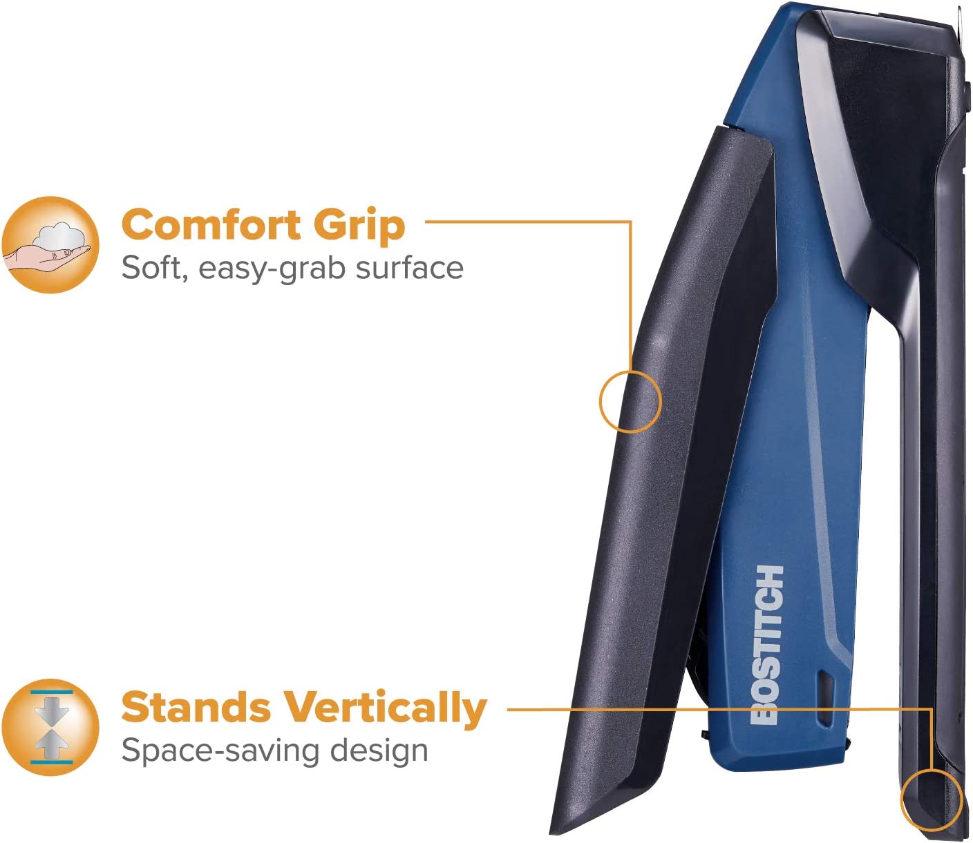 Effortless performance from a stapler that’s 80% easier to use: use just one finger to staple up to 20 Sheets of paper. Designed for convenience, it features a built-in staple remover for quick fixes and a hidden staple storage compartment to keep extra staples handy. Jam-free operation allows for smooth stapling of up to 20 Sheets. Opens for bulletin board tacking and crafting. Stands vertically or horizontally for easier access and storage. USES premium standard staples. Perfect for school, work, or the home office.
