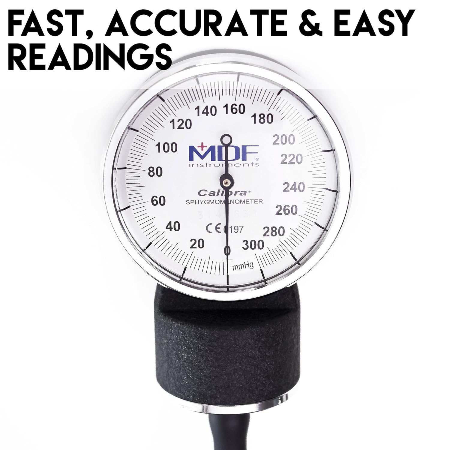 • GAUGE: easy to read, extra-large high-contrast dial, stress-tested over 3,000 times, calibrated five times and certified 300 mmHg manometer attains accuracy of +/- 3 mmHg without pin stop.