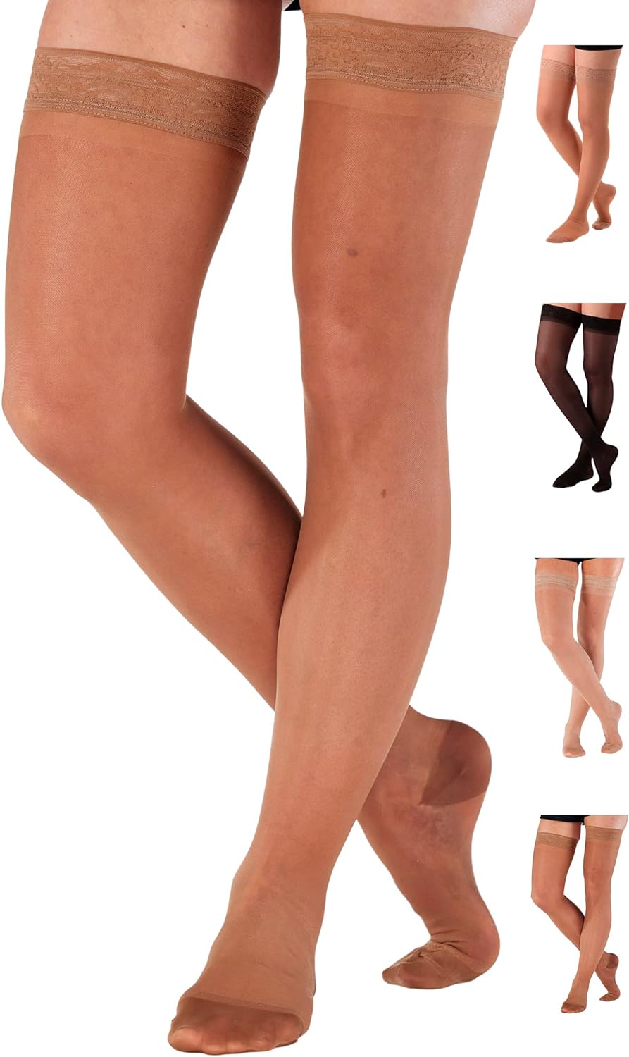 • Compression hose for women with silicone border the sheer material for women hugs legs to evenly reduce fatigue, pain and swelling.