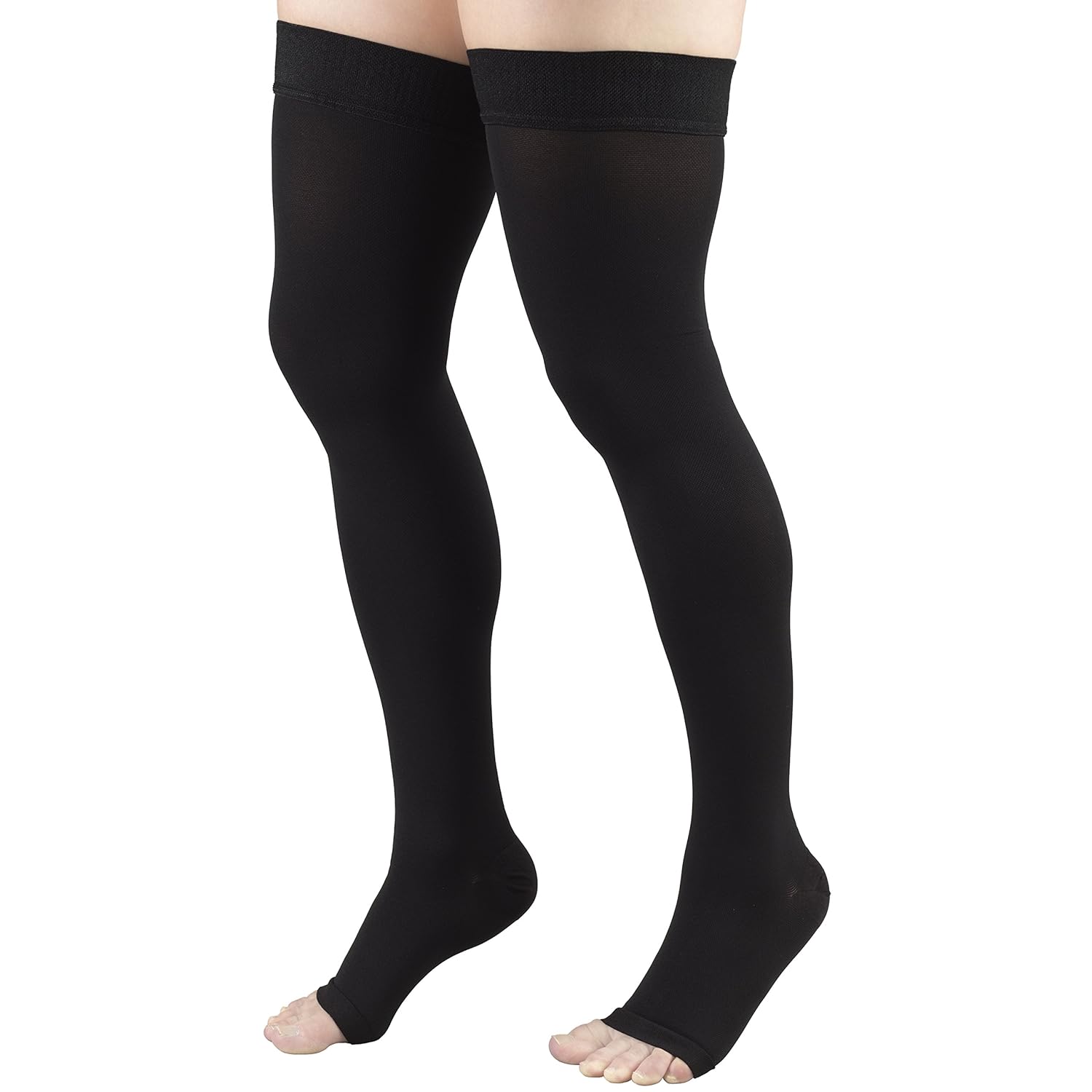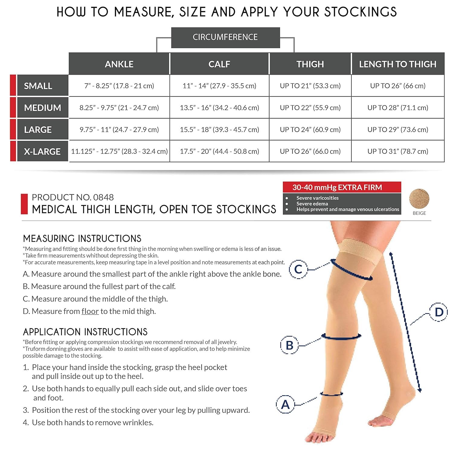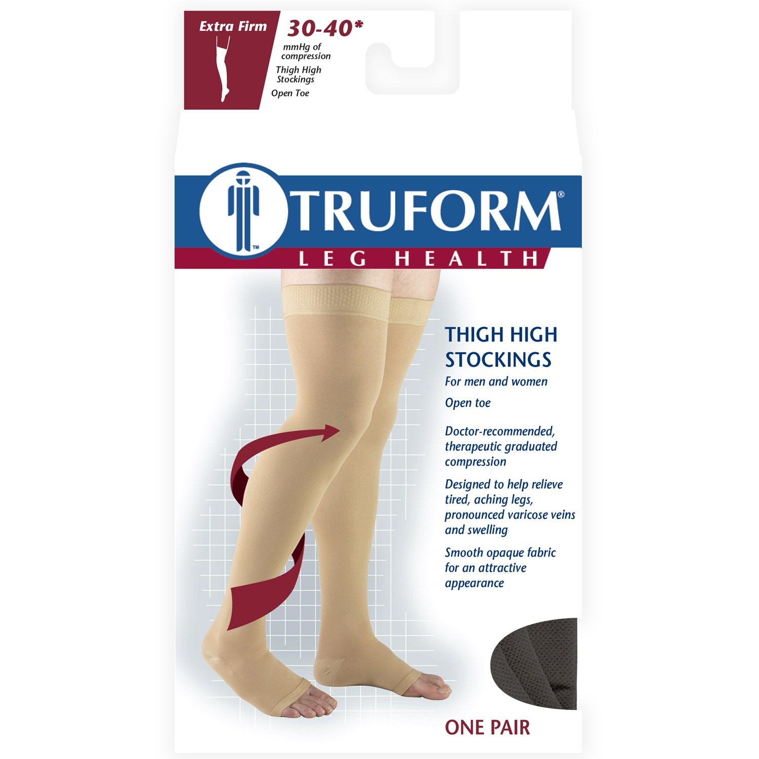 Truform 0848 was created to help relieve conditions associated with poor circulation. Graduated compression technology delivers a compressive action to the leg that is greatest at the ankle, then gradually decreases toward the heart. The 30-40 mmHg Very Firm compression level is great for post surgery and severe edema, varicose veins, spider veins, hypotension, post thrombotic syndrome (PTS), post sclerotherapy, and more. Truform therapeutic medical stockings feature classic styling and a smooth knit fabric that helps conceal unsightly conditions. The open toe feature allows for easy toe inspection and permits one standard size to fit a variety of foot dimensions. Color options are basic neutrals for all-occasion wear. Truform stockings, socks and pantyhose feature Graduated Compression Technology, which delivers a compressive action to the leg that is greatest at the ankle, then gradually decreases toward the heart. Graduated compression provides two primary benefits: it helps reduce and prevent swelling for the wearer, and the compression action help to prevent the slowing of blood flow so it can flow more quickly up the leg back toward the heart. Truform graduated compression support hosiery helps maintain positive circulation and leg health. We take the extra time and effort necessary to insure a therapeutically effective, comfortable fit. The combination of state-of-the-art materials and equipment, plus knitting know-how sets Truform apart from the crowd to make your legs look and feel great.