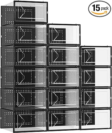 Shoe Storage Box, 15 Pack Clear Plastic Stackable Shoe Organizer for Closet, Interlocking Design Shoe Container Bins for Sneakers, Foldable Shoe Rack with Lids, Black