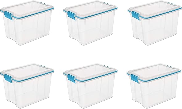 Sterilite 20 Qt Gasket Box, Stackable Storage Bin with Latching Lid and Tight Seal, Plastic Container to Organize Basement, Clear Base and Lid, 6-Pack