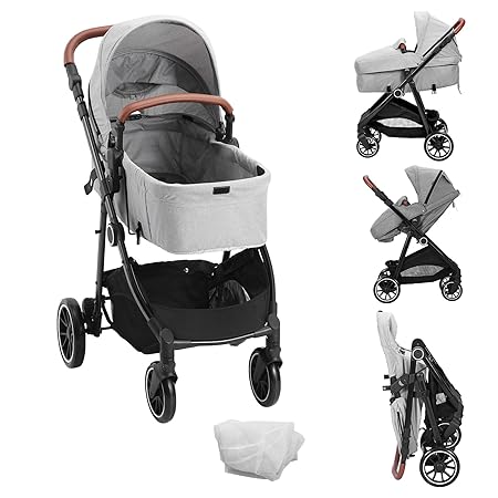 VEVOR Standard Baby Stroller, Infant Toddler Stroller with Bassinet, 3rd-Gear Adjustable Backrest & Foldable & Reversible Seat, Carbon Steel Newborn Stroller with Leg Cover and Mesh Net, Light Grey