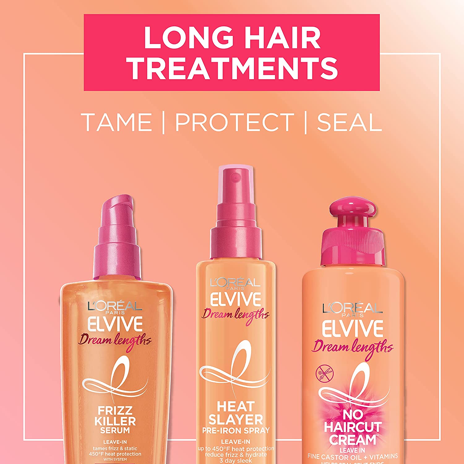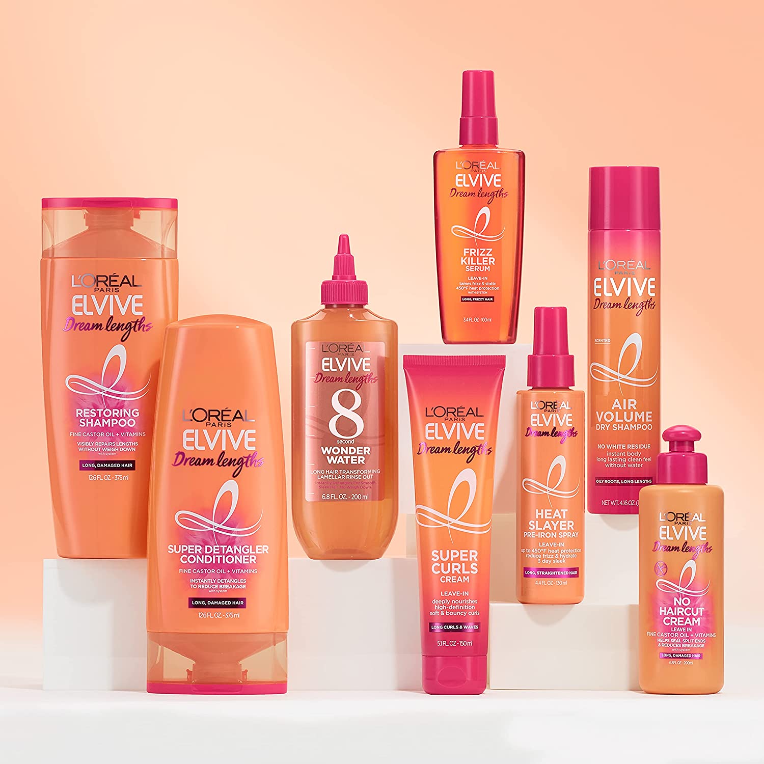 Long hair goals? Save that last inch. Elvive dream lengths system of shampoo, conditioner, treatments and dry shampoo cares for long hair and magnifies looks for the long hair of your dreams. Dream lengths restoring shampoo visibly repairs damage without weigh down, dream lengths super Detangler conditioner instantly detangles to reduce breakage, dream lengths no haircut cream leave-in conditioner helps seal split ends, dream lengths 8 second wonder water lamellar rinse-out instantly transforms long damaged hair in 8 seconds, Dream Lengths Heat Slayer pre-iron Spray leave-in protects against heat damage up to 450F degrees, dream lengths air volume dry shampoo instantly absorbs oil for a long-lasting clean feel with no white residue, dream lengths super curls cream leave-in deeply nourishes and defines curls and waves, and dream lengths frizz killer serum leave-in tames frizz and static.