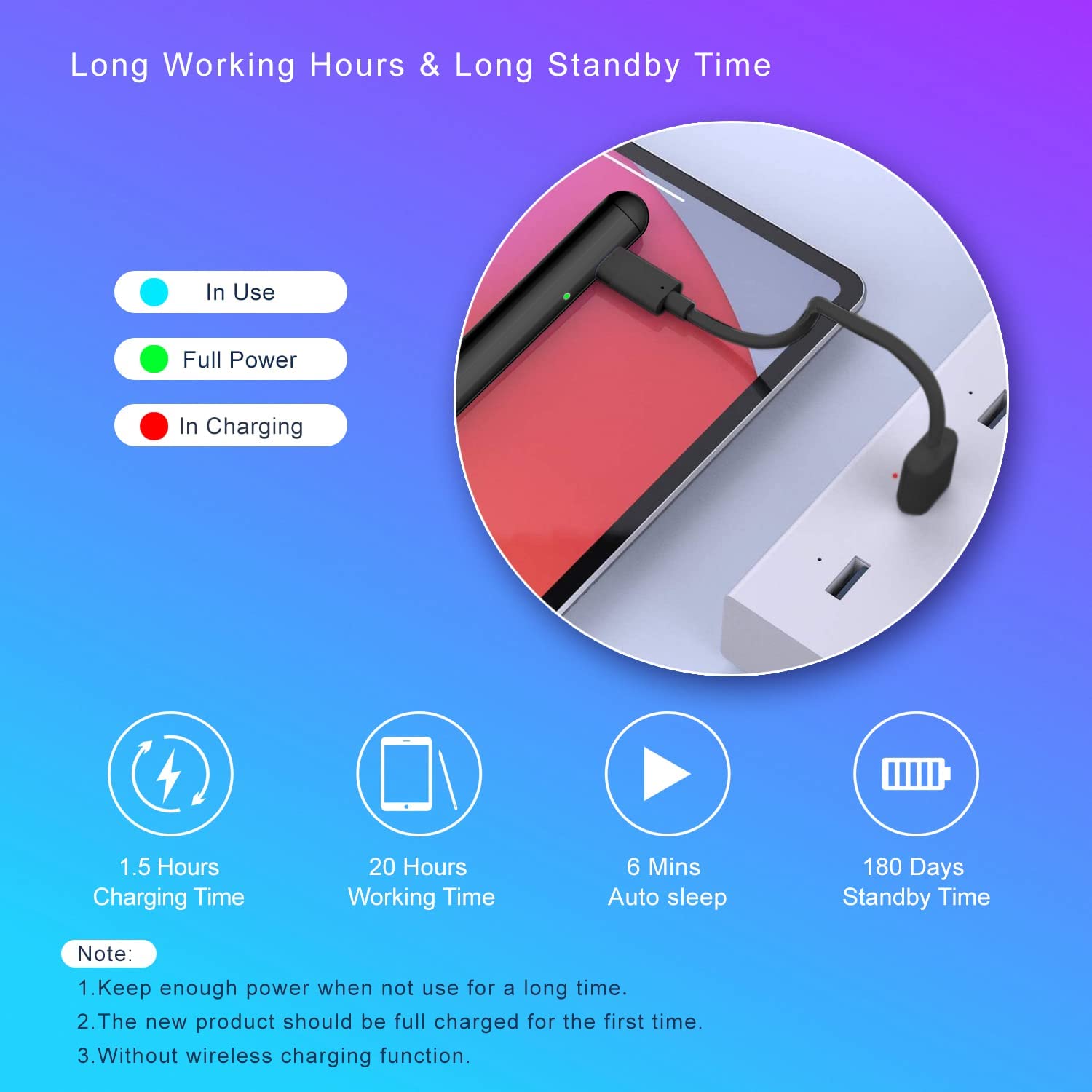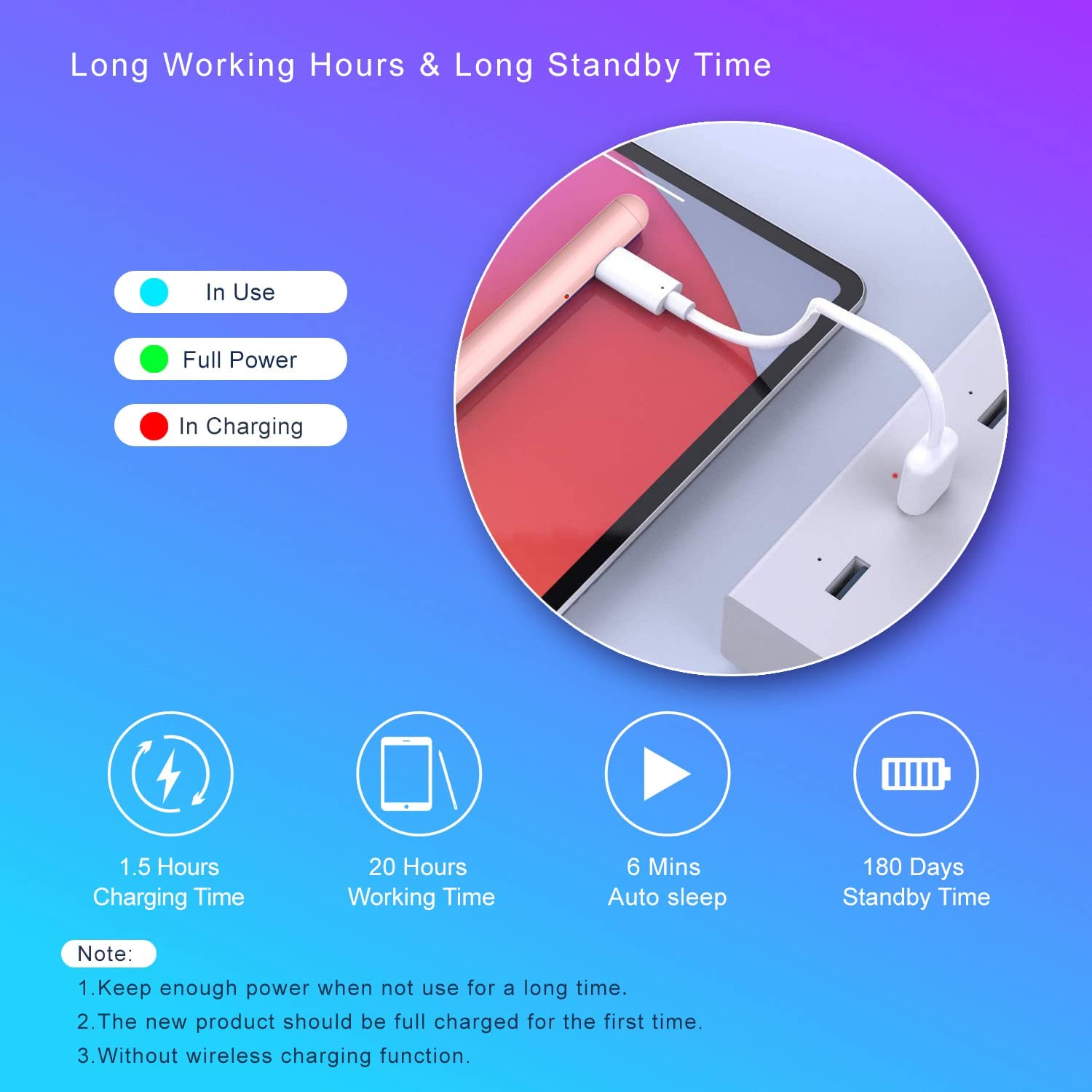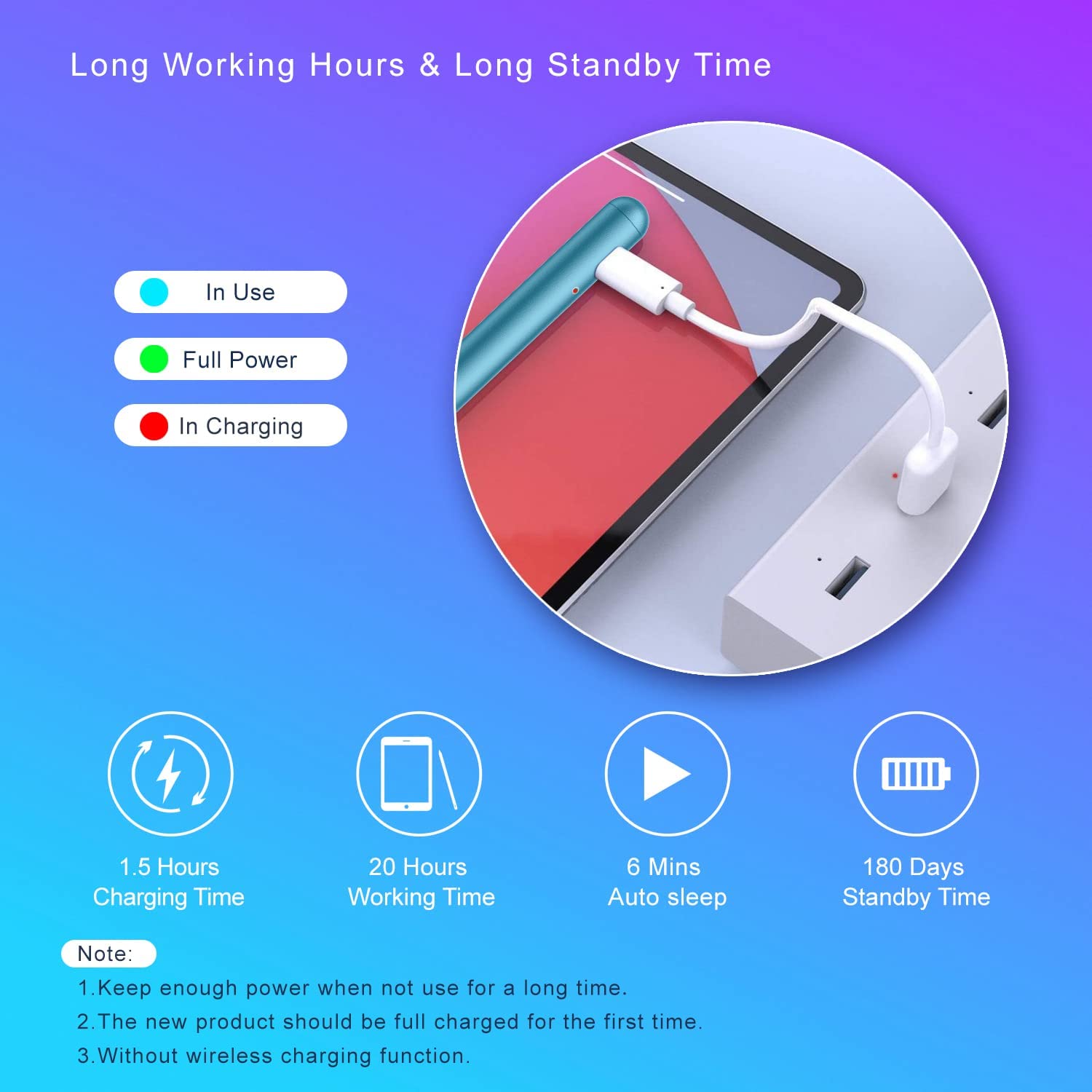 • Easy to Use and Extra Long Standby: No need to install Bluetooth or Apps, just turn on this Stylus Pen for iPad Pro by simply touching the cap button; iPad Pro Stylus pen for touch screen will automatically turn in "Sleep Mode" after idle for 6 minutes to save power. Max 20 hours continuous working time, 90 mins charging time, 180 days standby time.