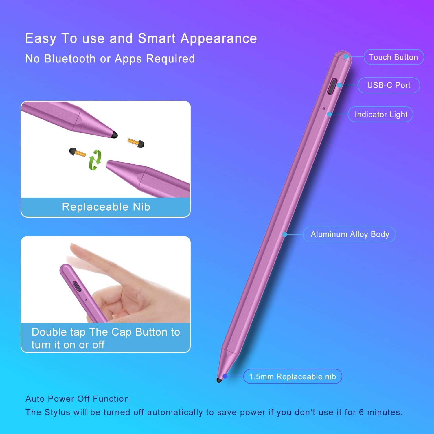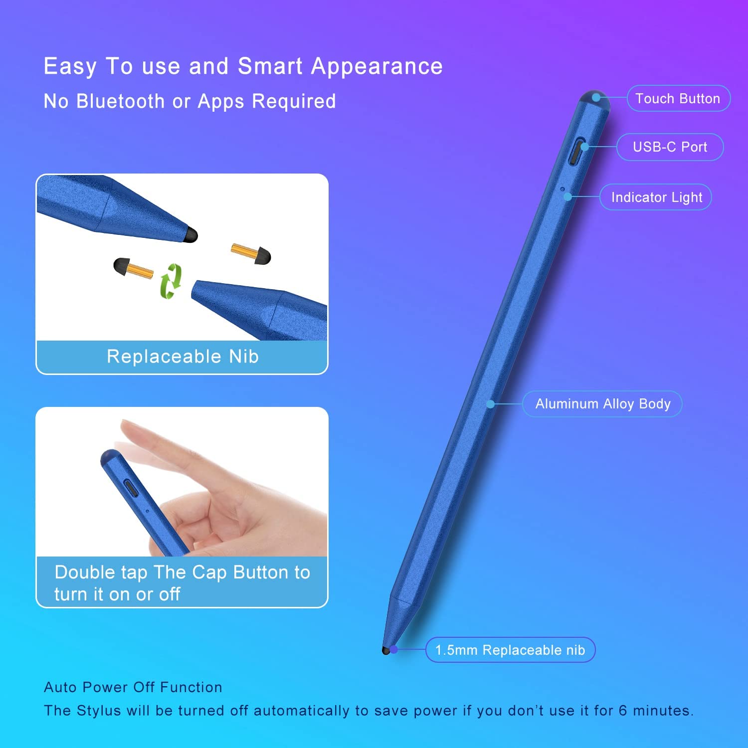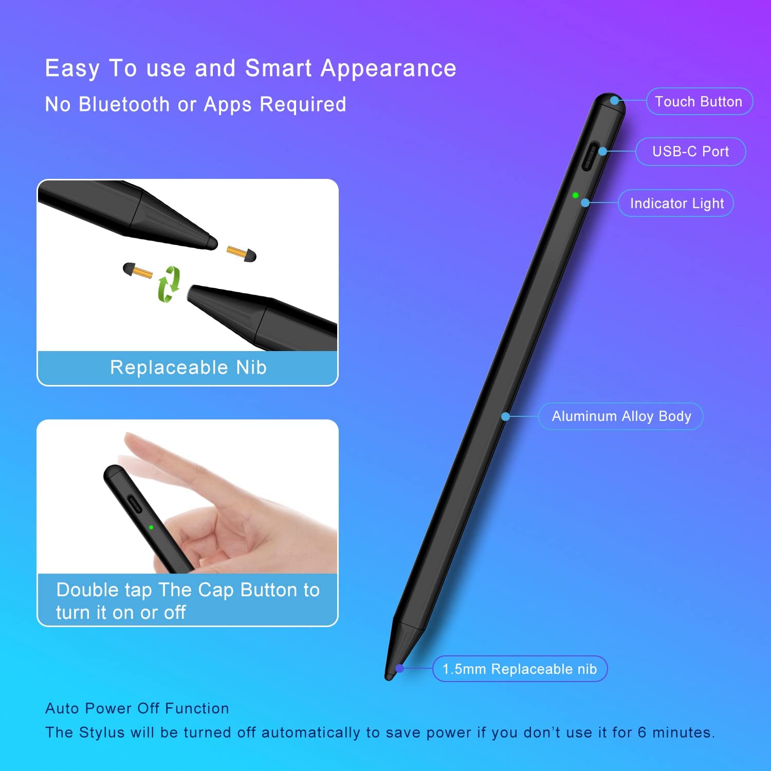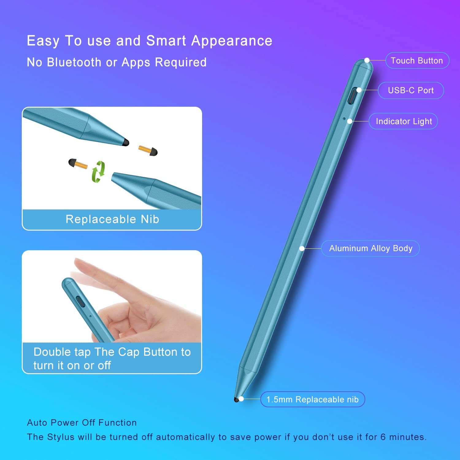 • Easy to Use and Extra Long Standby: No need to install Bluetooth or Apps, just turn on this Stylus Pen for iPad Pro by simply touching the cap button; iPad Pro Stylus pen for touch screen will automatically turn in "Sleep Mode" after idle for 6 minutes to save power. Max 20 hours continuous working time, 90 mins charging time, 180 days standby time.