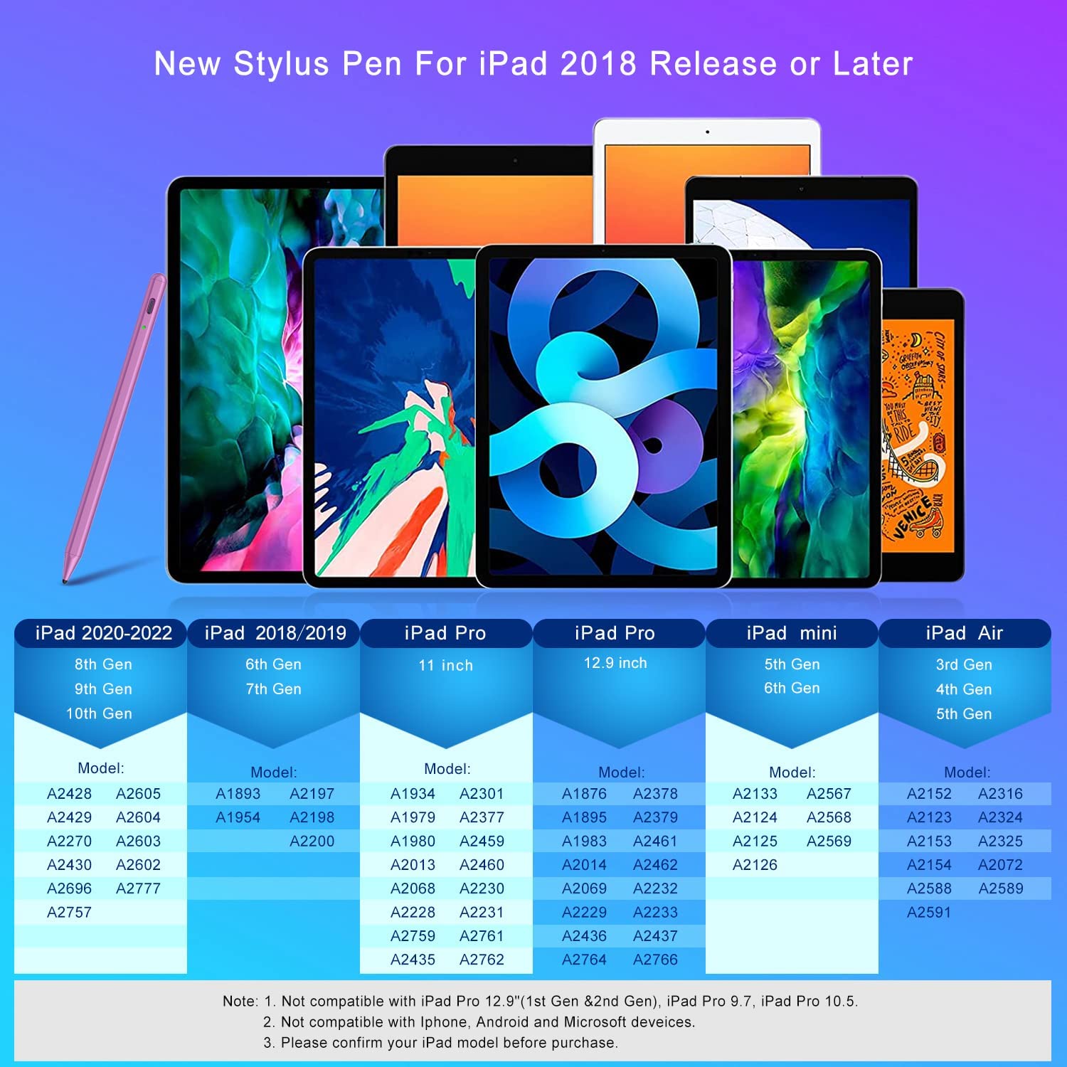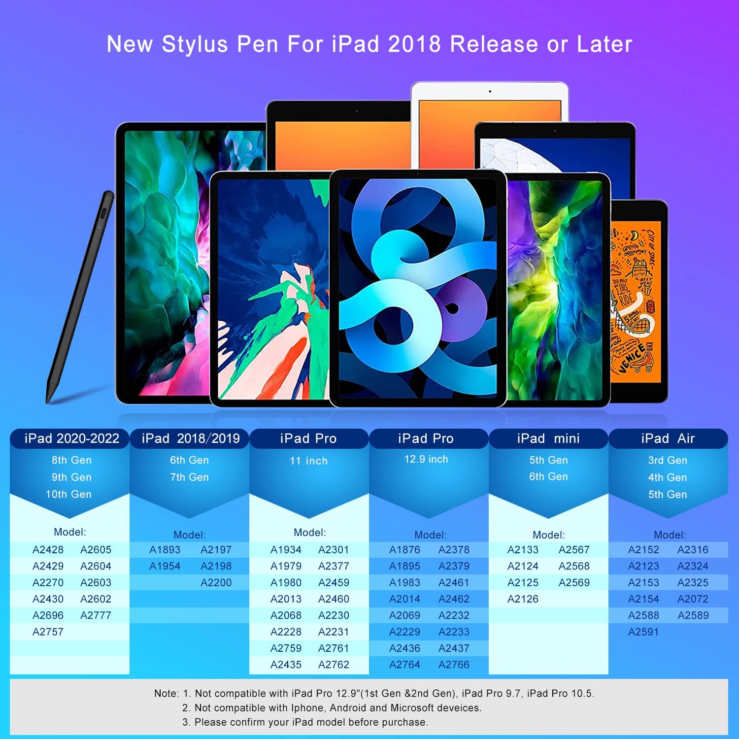 • Compatible:The iPad Pencil supports for iPad series 2018-2022 model: iPad 10th/9th/8th/7th/6th Gen,iPad Pro 11 inches/12.9 inches, iPad mini 5th/6th Gen, iPad Air 3rd/4th/5th Gen. Please confirm your devices before you place order the iPad Pen, other model is invalid.