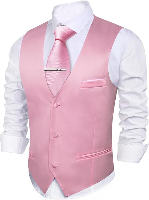 Barry.Wang Men's Pink White Necktie Business Suit Vest Slim Fit Solid Satin Wedding Dress Waistcoat for V-Neck Tuxedo Waistcoat