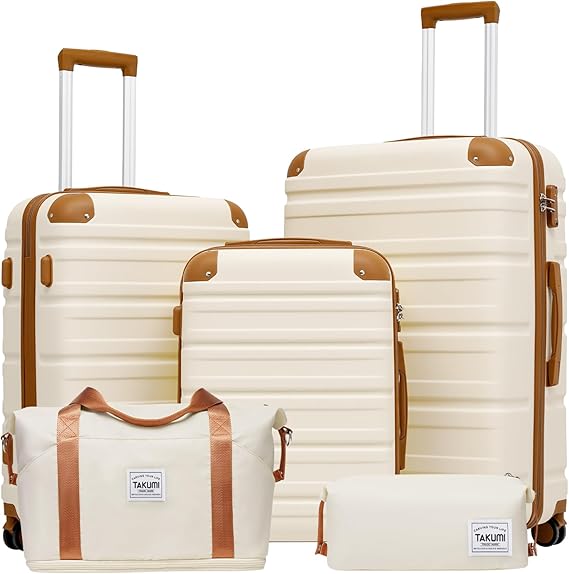 TAKUMI Luggage Set 5 Piece with Duffel Bag ABS Hardshell Suitcase Set with Double Spinner Wheels Travel Lugagge with TSA Lock Lightweight Carry On Suitcase (WHITE BROWN, 5 PIECE SET)