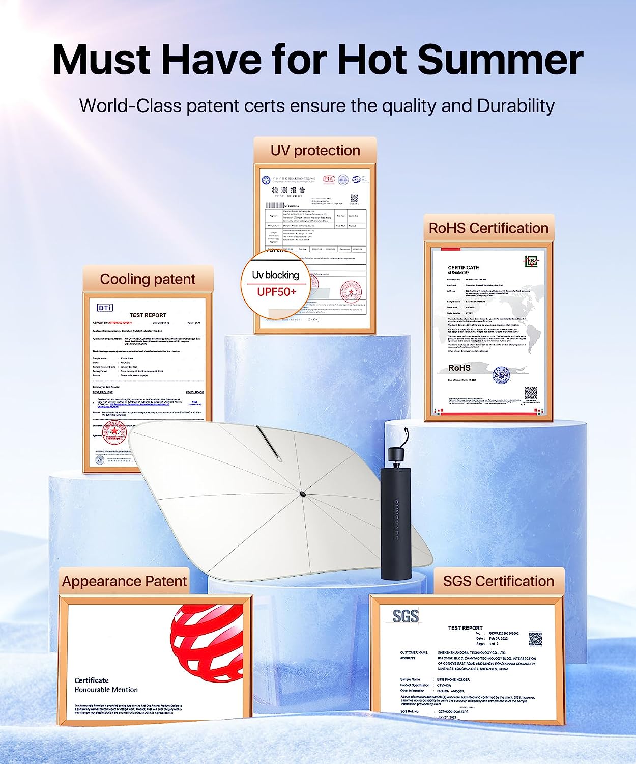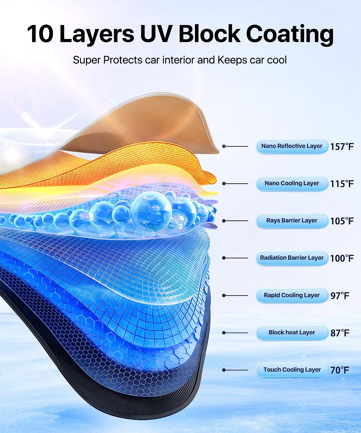 • [More Durable, Super Heat Insulation] Andobil has upgraded this car sun shade windshield from 3 directions; ①This newly upgraded car sun shade windshield is supported by 10 strong and soft fiberglass skeletons; ② The umbrella handle can be adjusted in three positions to prevent accidental scratching of the dashboard and screen; ③ Upgraded 6mm double-layered windshield sun shade effectively provides double insulation against sun heat and harmful UV rays, reducing the temperature up to 70°F.