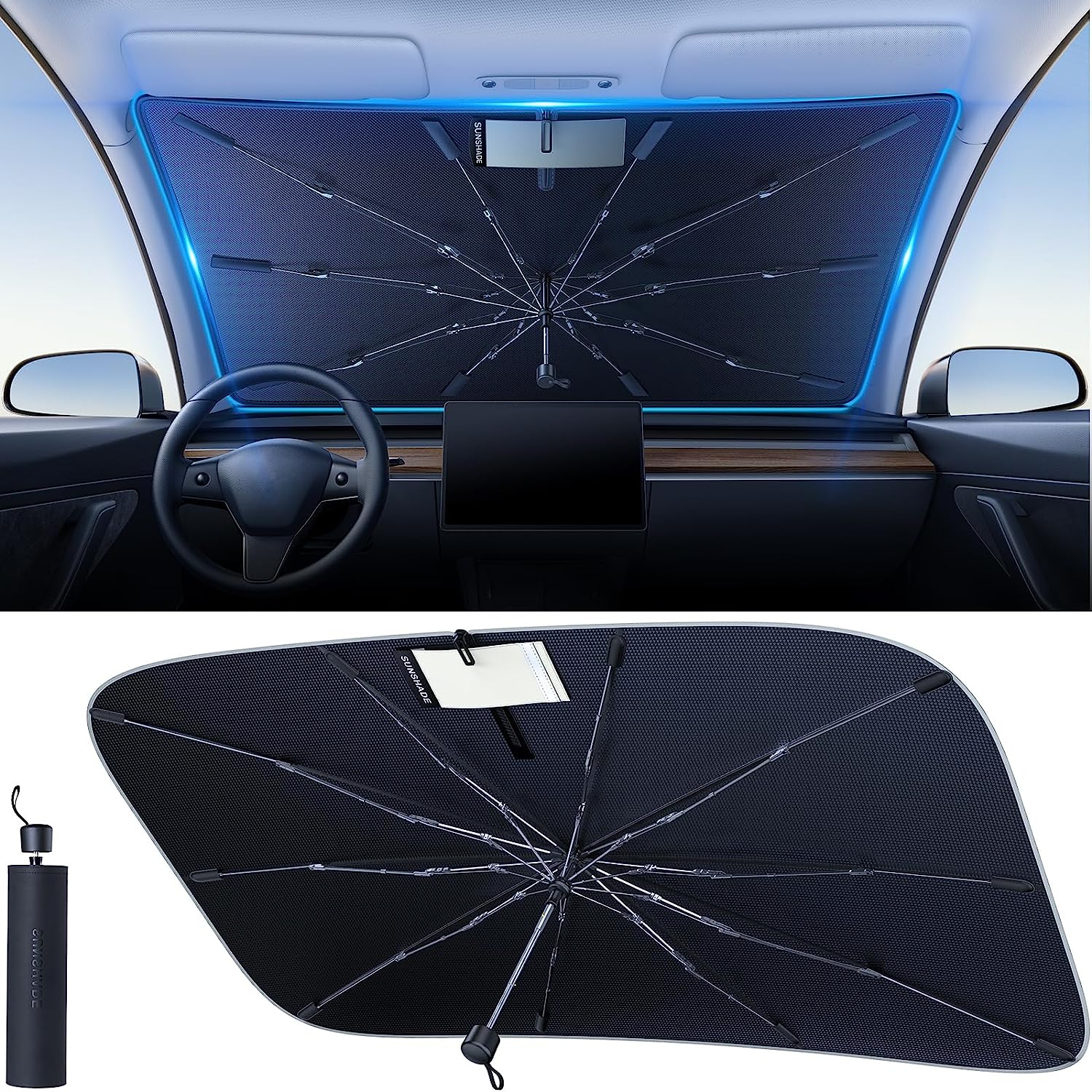 • [Wider Coverage and Compatibility] With over 99% coverage, This brella shield for car windshields is suitable for most small and medium cars, SUVs, Tesla, and trucks. Tips: Please be careful to check your windshield size, we has two sizes for different car models: Large(60*34inch), Medium(56*33inch) ; By the Way, andobil car shade front windshield can also be used as an umbrella for emergency use on rainy or sunny days.
