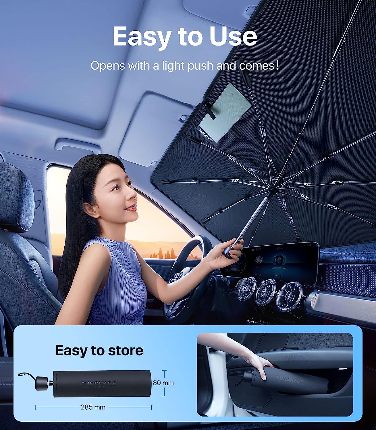 • [Easily Install and Store] This foldable Umbrella Sun Shade quick to Use like Umbrella, Compact to Store. Just need 2s to open the umbrella and finish installation instead of folding windshield sun shade over and over again. Simply click the locking and shut into its compact size to easily store it in the glove box, door panel or under the seat without taking up extra car space.