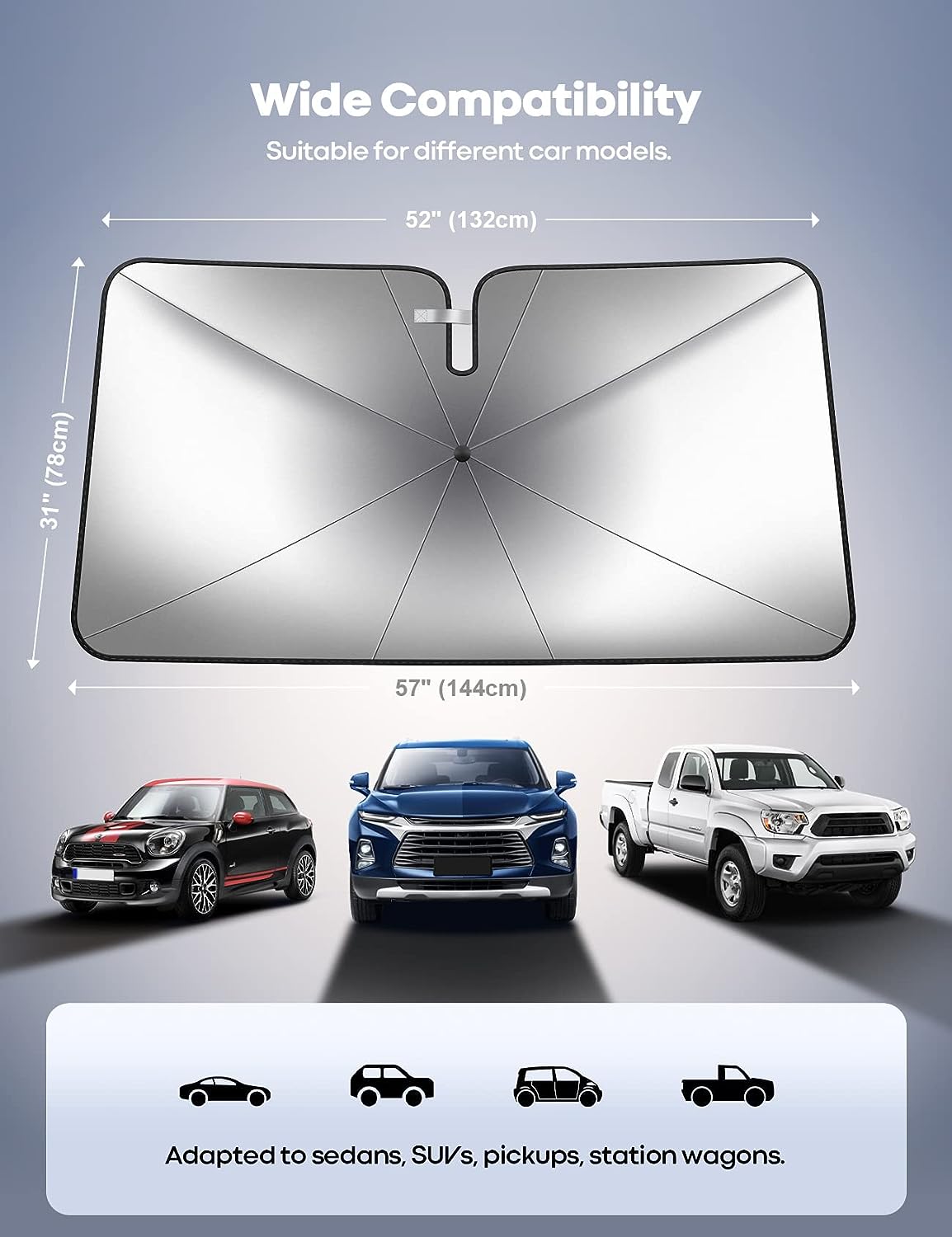 • 【 Universal Size】 With universal size of 31" (Wide), 52" (Top side), 57" (Bottom side), Can be adapted to more different models with bendable umbrella skeletons. ❗ Recommended to measure the size of your car windshield before order to check if it is applicable. Fit the car model of Tesla, Ram, Ford, Toyota, Honda, Subaru, Jeep, Dodge, Chevy, Audi, Buick, Hyundai, Cadillac, Lexus, Nissan, Mercedes, Bmw, Gmc, Broncos, Tundra, Mazda, Kia, Sedan, SUV, Pickup.
