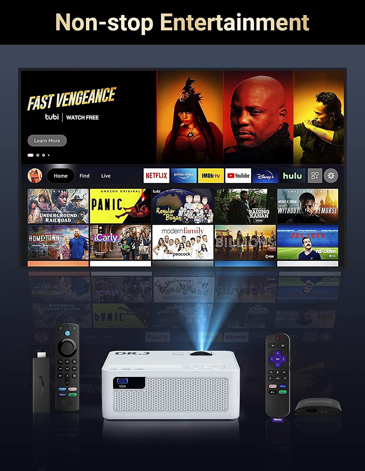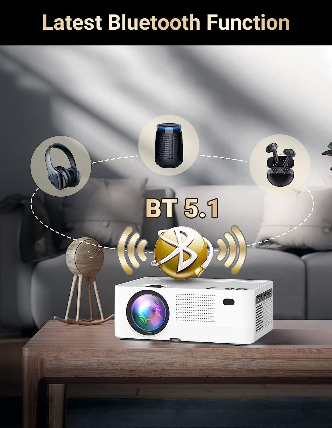 • BLUETOOTH CONNECTION & HIFI DUAL STEREO SPEAKER: DRJ native 1080P projector is equipped with the latest 5.1 Bluetooth technology. It can help you enjoy your Bluetooth speakers and headphones wirelessly via Bluetooth with no more extra cables. It also contains built-in dual 5W stereo speakers. Enjoy our DRJ projector with your Bluetooth speakers/headphones or with its original built-in speakers, and be prepared to immerse yourself with home theater sound experience.