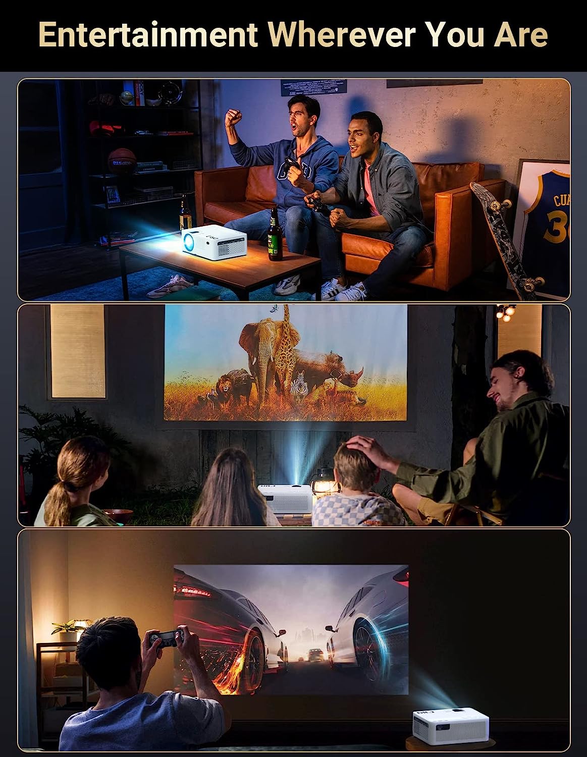 • 120INCH PROJECTOR SCREEN INCLUDED: To make it much easier for our customer’s outdoor movie fun, this outdoor projector is packed with an upgrade 120Inch portable projector screen for you. It will perform great for your indoor and outdoor home entertainments. Don’t forget the beautiful night to have a great movie with your family and friends by the campfire every weekend.