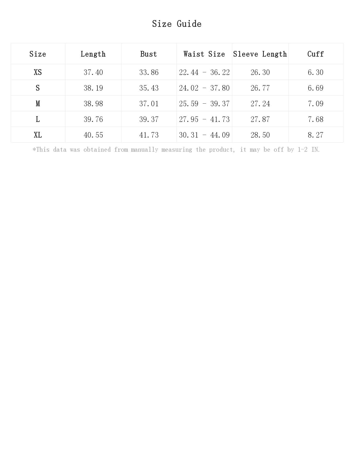 XL:Bust:41.7IN,Cuff:8.3IN,Length:40.6IN,Sleeve Length:28.5IN,Waist Size:30.3-44.1IN