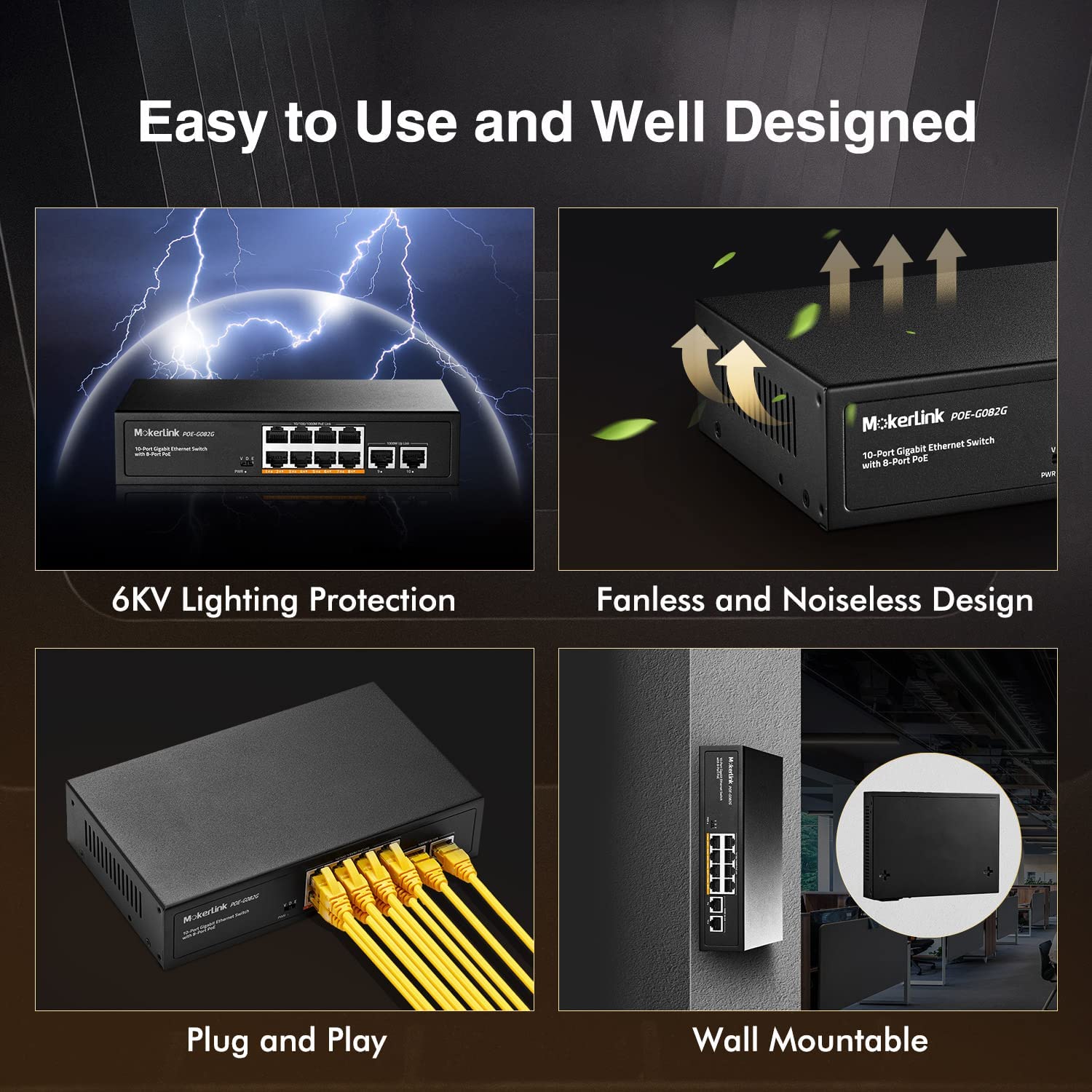 • High POE Power: Maximum support 800W high output power, built-in power supply makes installation easier. Support IEEE 802.3af/at, each port max power supply reached 30W. *Please note: it will not supply power to passive 24V PoE and NON-PoE devices.*